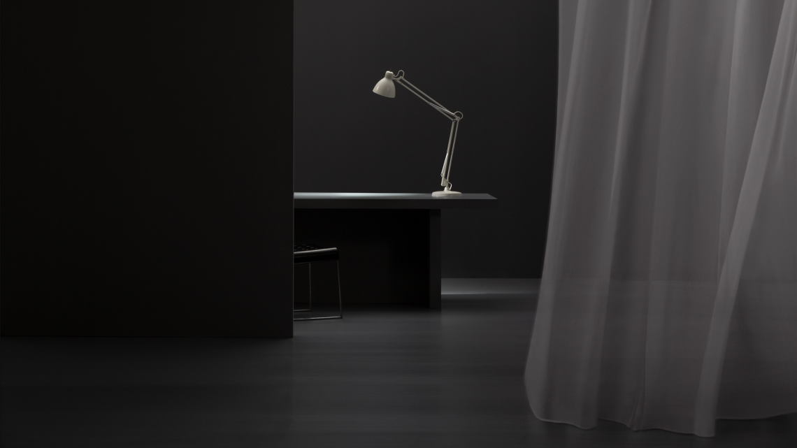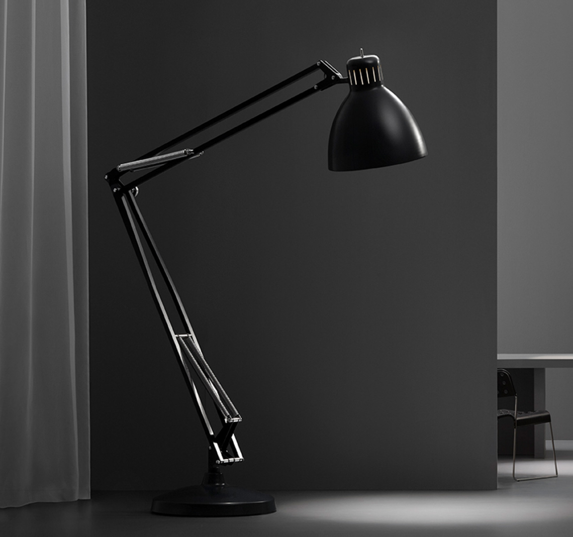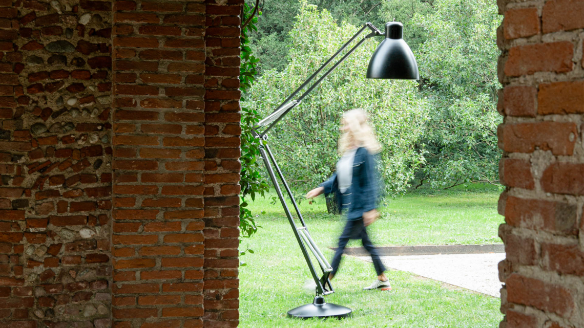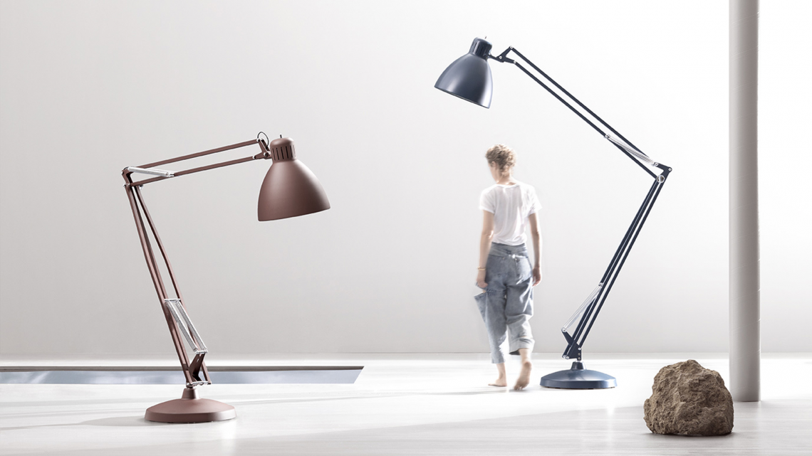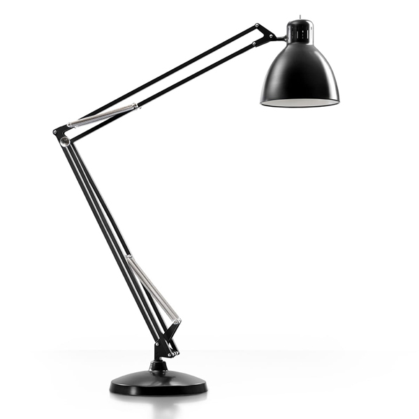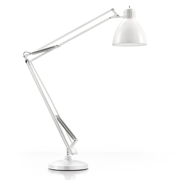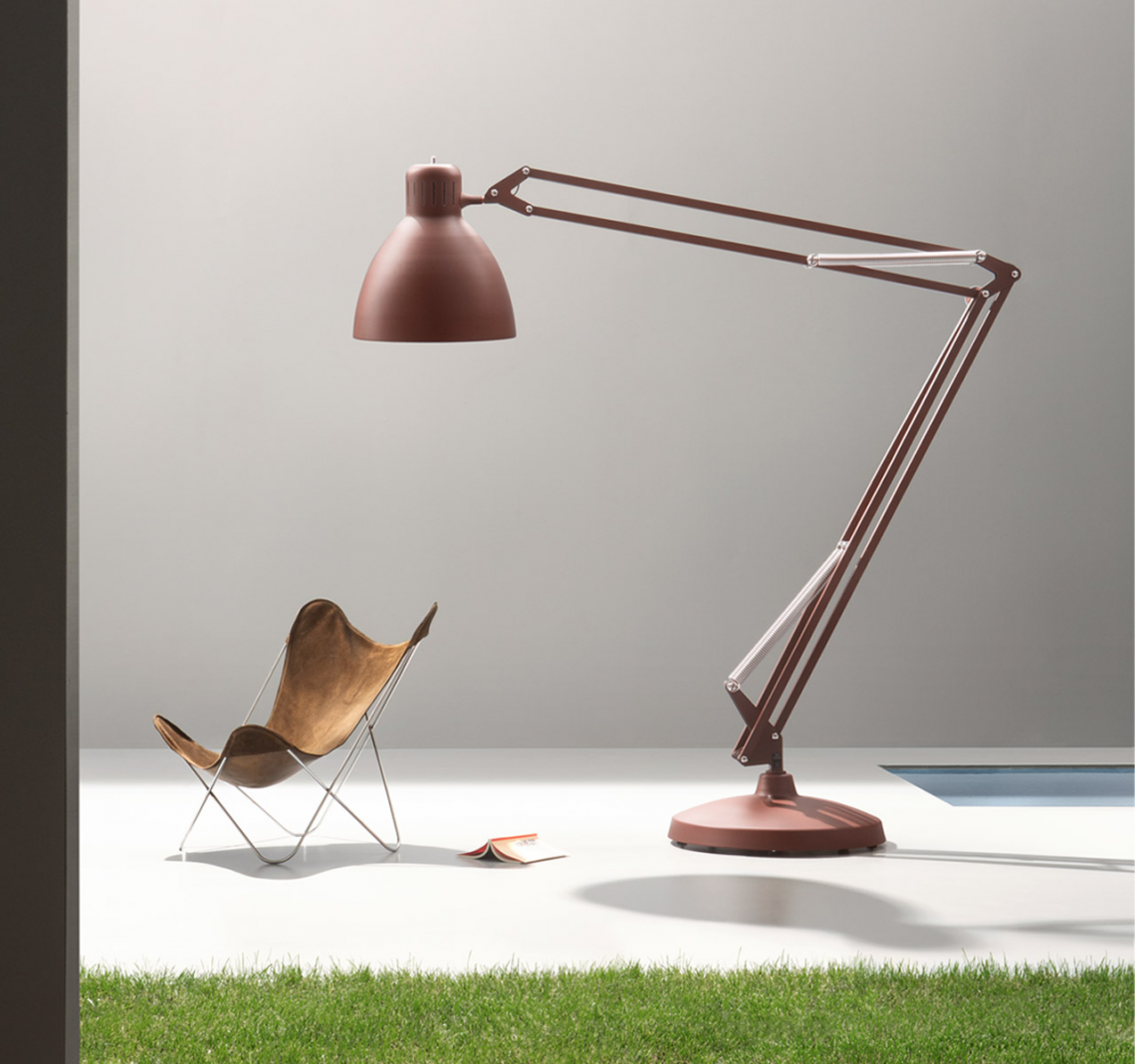 Large scale, matte lacquered, aluminum floor lamp. Available in six colors options with outdoor grade finish for maximum UV protection on both outdoor and indoor versions: white, black, amarant red, mica blue, sablé grey and rust brown with matching steel base. Interior of the diffuser in white lacquer. Custom colors available upon request. Dimmable LED light source (user replaceable). Dimmer on cord (push-dim) or with wireless CASAMBI? Smart Lighting Control.