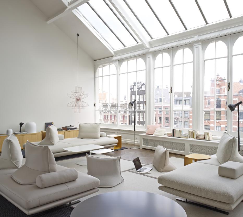 Quite apart from the habitual styling exercise which surrounds a new settee - which consists of a principally aesthetic proposal - Prado represents first and foremost an approach based on the study of lifestyles, or in short, the human being. Here, therefore, we find the same ambition as that which brought us Smala in the early part of the new century. Prado consists of a vast seat which may be used either independently or with other elements, on which back cushions may be scattered at will. There is total freedom since these cushions, which are weighted and equipped with an anti-slip system, will remain in place without needing to be leant against or attached to anything. They could therefore be arranged on the floor for a few leisurely moments around a low table, whilst the seat could do duty as an occasional bed simply by turning over its seat cushion, the reverse of which is covered with mattress ticking.