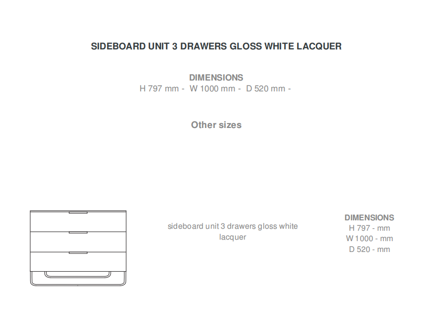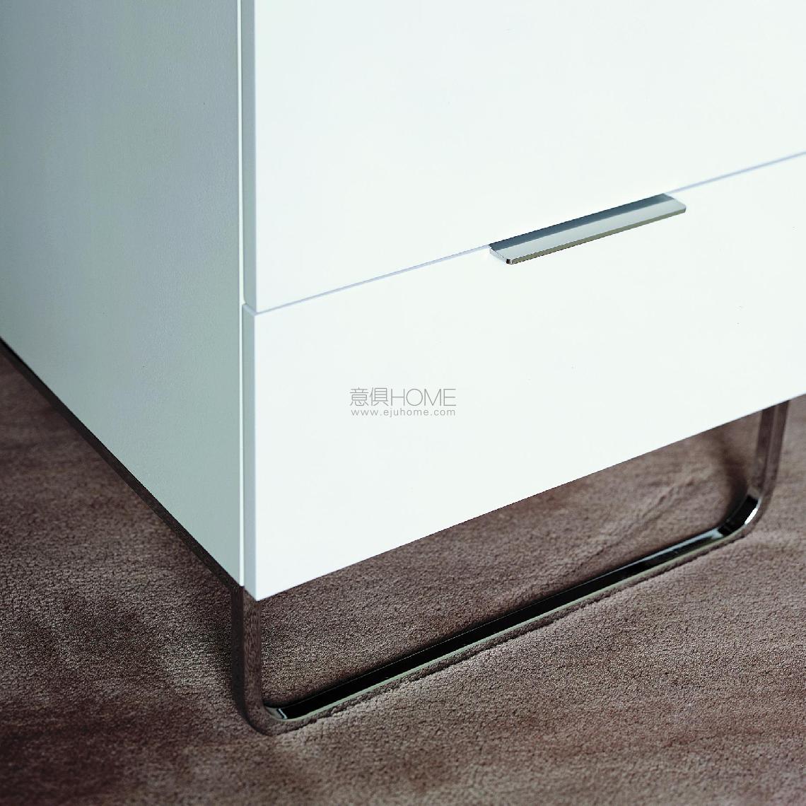 Collection of pieces with a 'cabinet-made' feel, with frames in multi-ply finished in gloss white lacquer : their rounded rear corners are characteristic of the collection. Brilliant-chromed handles and metal underframes. Drawer runners equipped with controlled automatic closing.