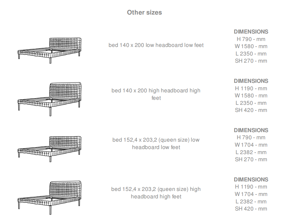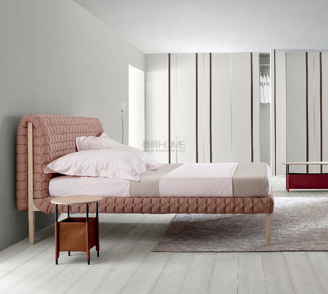 As with the Ruché settee, the Ruché bed is lifted from the ground by a simple, fine structure which supports a comfortable sleep platform. The headboard and frame are dressed with a distinctive quilting, a kind of boutis stitch of padding made using a cross-hatching of interrupted seams. Alternately flattened by the stitches then set free, the fabric 'curls' in places, giving rise both to its unique appearance and to its name, Ruché (a gathered or pleated fabric which serves as decoration on a piece of clothing). For Ligne Roset, Ruché also brings together the unusual and the traditional. The unusual thing about this piece is its solid wood structure, and the great traditional element: the quilting, the very heart of its savoir-faire. Its rangy uprights and the undulations of its duvet combine to produce a harmonious union of rigorous straight lines and soft, welcoming curves.