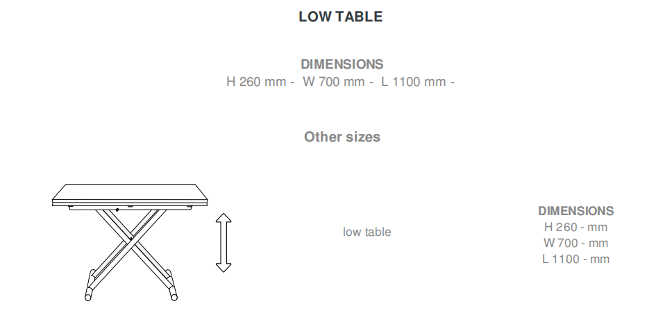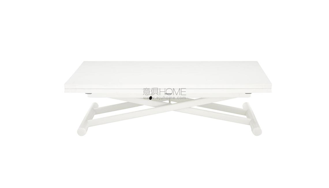 Continuously height-adjustable table. Base in Epoxy satin white lacquered steel slides effortlessly thanks to the two integral black plastic castors on each side. Folding top in satin white lacquered MDF, thickness 2.5 cm.