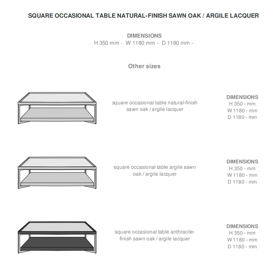 Low tables with base in argile lacquered steel and thick lower top in sawn oak. The upper top, also in oak, has a tray covered in Pebble- coloured linoleum glued onto 5 mm thick HPL laminate. This tray with its raised linoleum top is easy to clean and may easily be removed with the aid of the screw underneath.