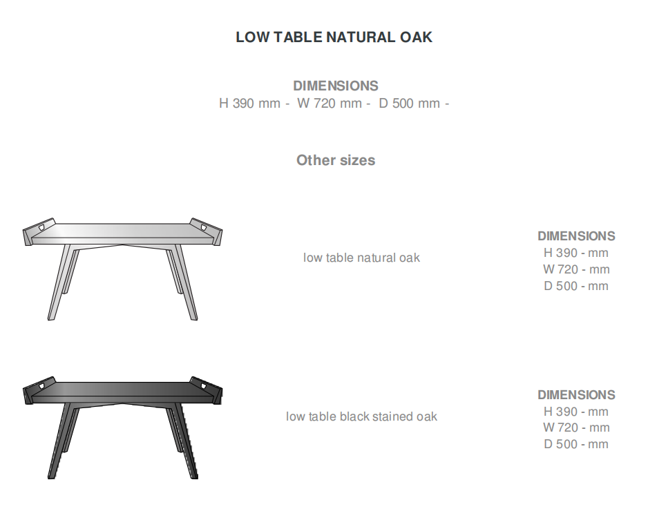 A reproduction of an occasional table which was amongst Pierre Paulin's very first designs from 1953. Scandinavian-inspired, the purity of its lines, its geometric treatment and in particular its four oblique legs are characteristic of the style of the Fifties. Its cutout hand-holds lend it a mobility which also enables it to be used as a serving or breakfast tray. Mobile occasional table in solid natural or black-stained oak or in wild cherry. Top with two cutout handles. Slim lateral edging on the two long sides. The screen-printed signature of Pierre Paulin appears in light grey on the edge of the top near the handle.
