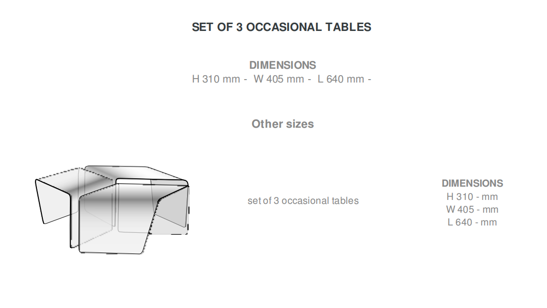 Set of 3 low tables in 10 mm thick clear curved glass. Each table is identical. The above- indicated dimensions are those of a single table. The overall dimensions of the 3 tables when arranged in 'circular' fashion is 31 x 88 x 78 cm.