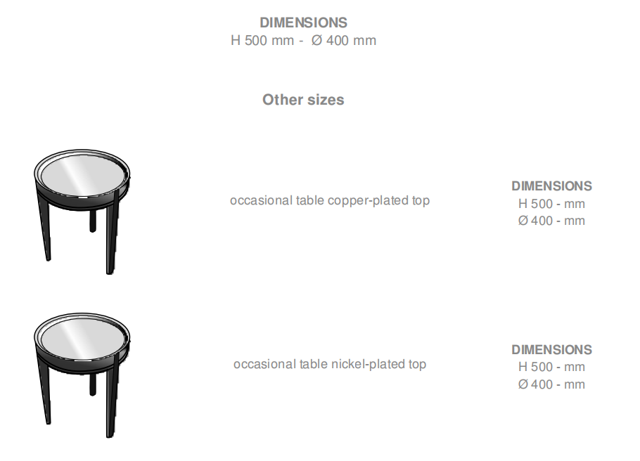 This occasional/sofa end table comprises a tripod base in satin-finish black-stained solid ash. It takes a removable round top (H 1.5 ? 40 cm) in gloss-finish solid copper finished with a rust-proof transparent varnish or in nickel-plated steel.