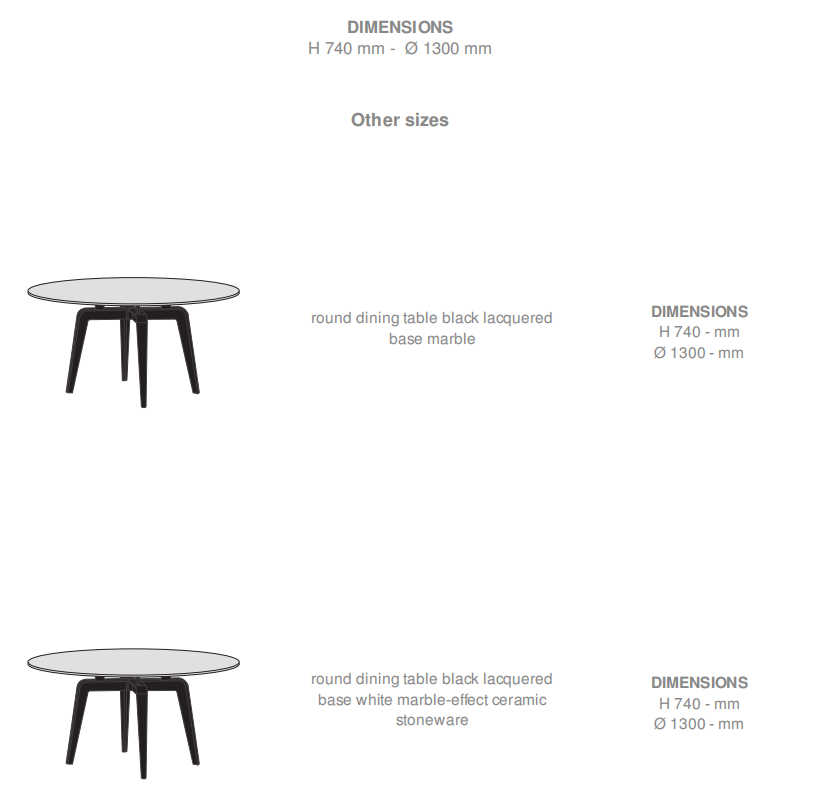 Dining table with base in folded lacquered steel. WOODEN TOPS : in matt varnished solid European walnut blockboard or natural solid oak, thickness 40 mm, with streamlined edges. CERAMIC STONEWARE TOPS (for round and oval tables) : in 6 mm thick full body ceramic stoneware (metallic anthracite, white marble- effect, or white) glued onto an 8 mm thick sheet of glass (total thickness 14 mm). CERAMIC STONEWARE TOPS (for rectangular tables) : in 6 mm thick full body ceramic stoneware (metallic anthracite, white marble- effect or white) glued onto a 12 mm thick black or white lacquered MDF set back slightly from the edge of the top & screwed to a 12 cm steel support set back 12 cm from the edge of the top. MARBLE TOPS (round table ? 130 cm only) : 20 mm thick Carrara marble. The round tables ? 130 cm and ? 148 cm, the oval table and the rectangular tables L 200 / 220 / 240 / 260 are only available with fixed tops. The rectangular table L 180 is available with a fixed or extending top (with 1 x integral 59 cm extension). In the wooden versions (natural oak and walnut) the extension (W 59 cm) is matched to the top. The top and extension are in 27 mm thick solid wood with streamlining on the long edges ; the blocks from which they are comprised are arranged transversally to ensure continuity between the appearance of the top and that of the extension, and to ensure that the top of the extension and the tops of the two half tops sit flush with each other when the extension is in place.