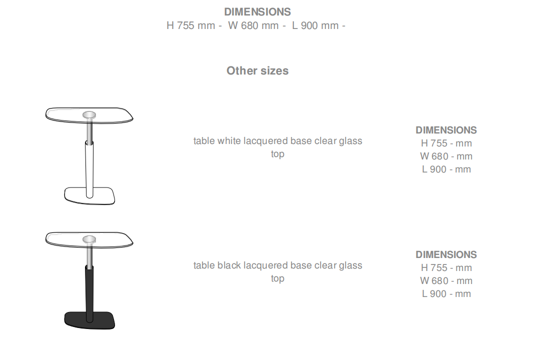 Piazza offers a top cut in an elegant and original elliptical shape with one straight side - thus enabling it to be pushed against a wall when not in use, a clever space-saving trick. Just pull it out from the wall to seat four persons around its 90 x 68 cm top. Base and stem in Epoxy lacquered steel. Piston barrel in brilliant-chromed steel with operating lever. Top in 15 mm thick clear toughened glass with polished edge or in MDF finished in matt soft-touch Fenix NTM laminate, accommodating up to 4 persons. The height of the top is continuously adjustable from 75.5 cm to 100.7 cm (from dining table height to bar table height - for use with the Pam bar stools).