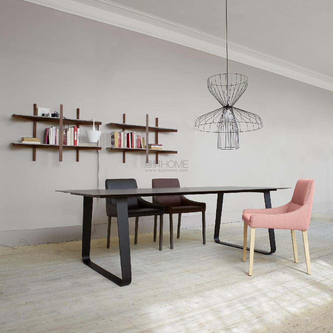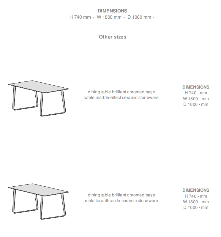 A table of extremely pared-down lines comprising a top which is linked to the base by a large section frame with a plate to which the legs are attached. The top, which overhangs by around 12 cm, renders the structure barely visible. The designers present Vilna as an innovative table, a design object, with its overhanging top and sharp-looking metal base. WOODEN TOPS : in 40 mm thick matt varnished solid European walnut or natural solid oak with streamlined edges. CERAMIC STONEWARE TOPS : in 6 mm thick full body ceramic stoneware (metallic anthracite, white marble-effect or white) glued onto a 12 mm thick black or white lacquered MDF set back slightly from the edge of the top & screwed to a 12 cm steel support set back 12 cm from the edge of the top. The rectangular tables L 200 / 220 / 240 are only available with fixed tops. The rectangular table L 180 is available with a fixed or extending top (with 1 x integral 59 cm extension). '' In the wooden versions (natural oak and walnut) the extension (W 59 cm) is matched to the top. The top and extension are in 25 mm thick solid wood ; the blocks from which they are comprised are arranged transversally to ensure continuity between the appearance of the top and that of the extension, and to ensure that the top of the extension and the tops of the two half tops sit flush with each other when the extension is in place.