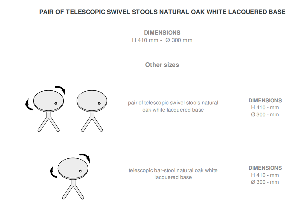 The IKE swivel stool stands on three legs. The steel tubular support for the thread of the endless screw splits into three to form the three legs. The 'studio' spirit of this technical base is softened by its white lacquer finish and harnessed by its natural oak seat. Height-adjustable swivel stool. Seat in 20 mm natural varnished solid oak with thumbhole (for both ease of manipulation and to assist in adjusting the height between 41 and 55 cm). Screw support and endless screw in zinc-coated metal. Base in white lacquered steel. Protective gliders.