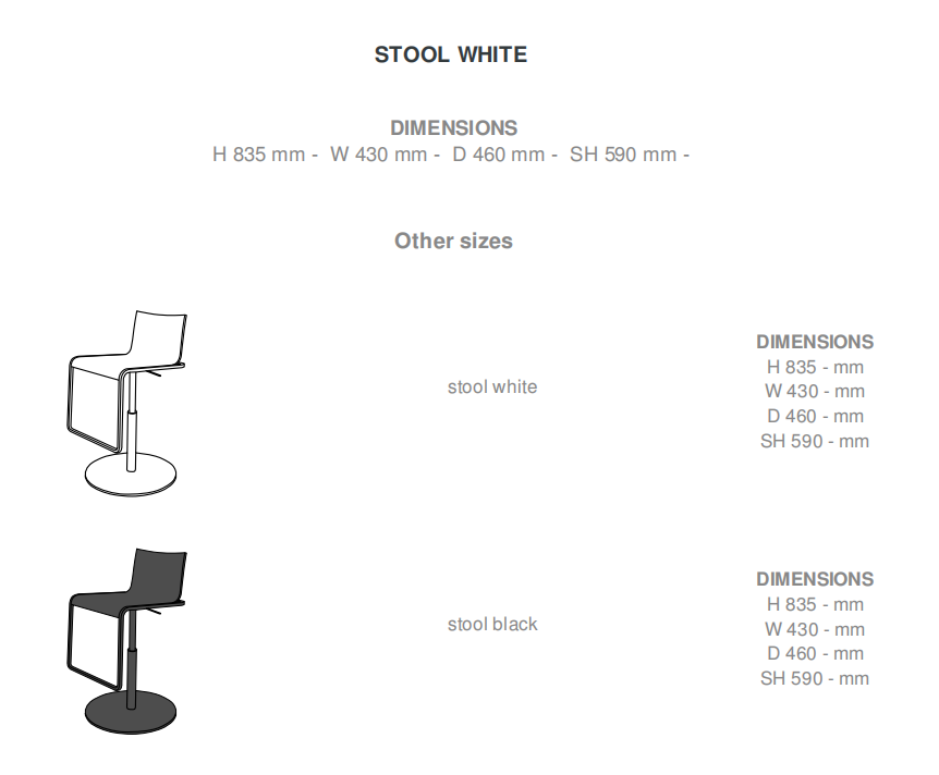 Frame in gloss Epoxy lacquered steel; seat shell in gloss lacquered multi-ply. In highest position seat height is 80 cm, with overall height 104.5 cm.
