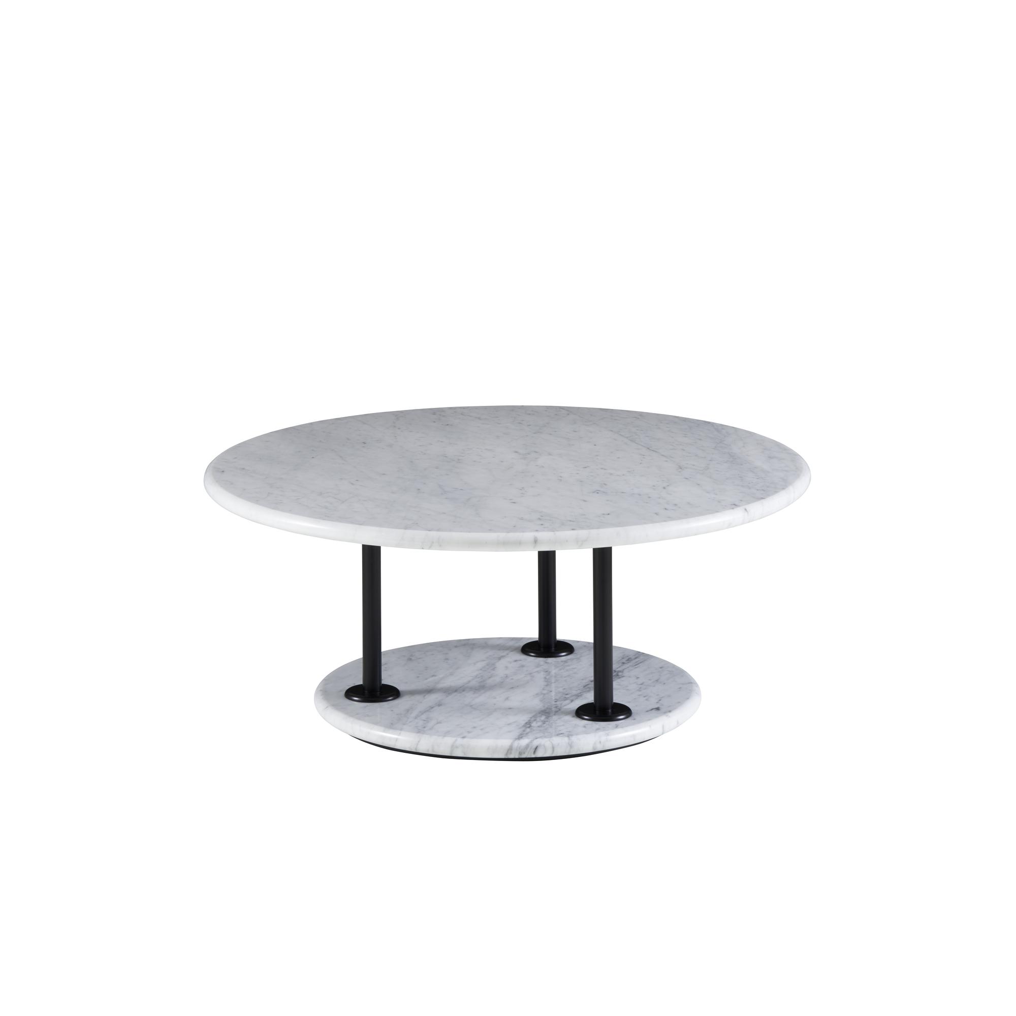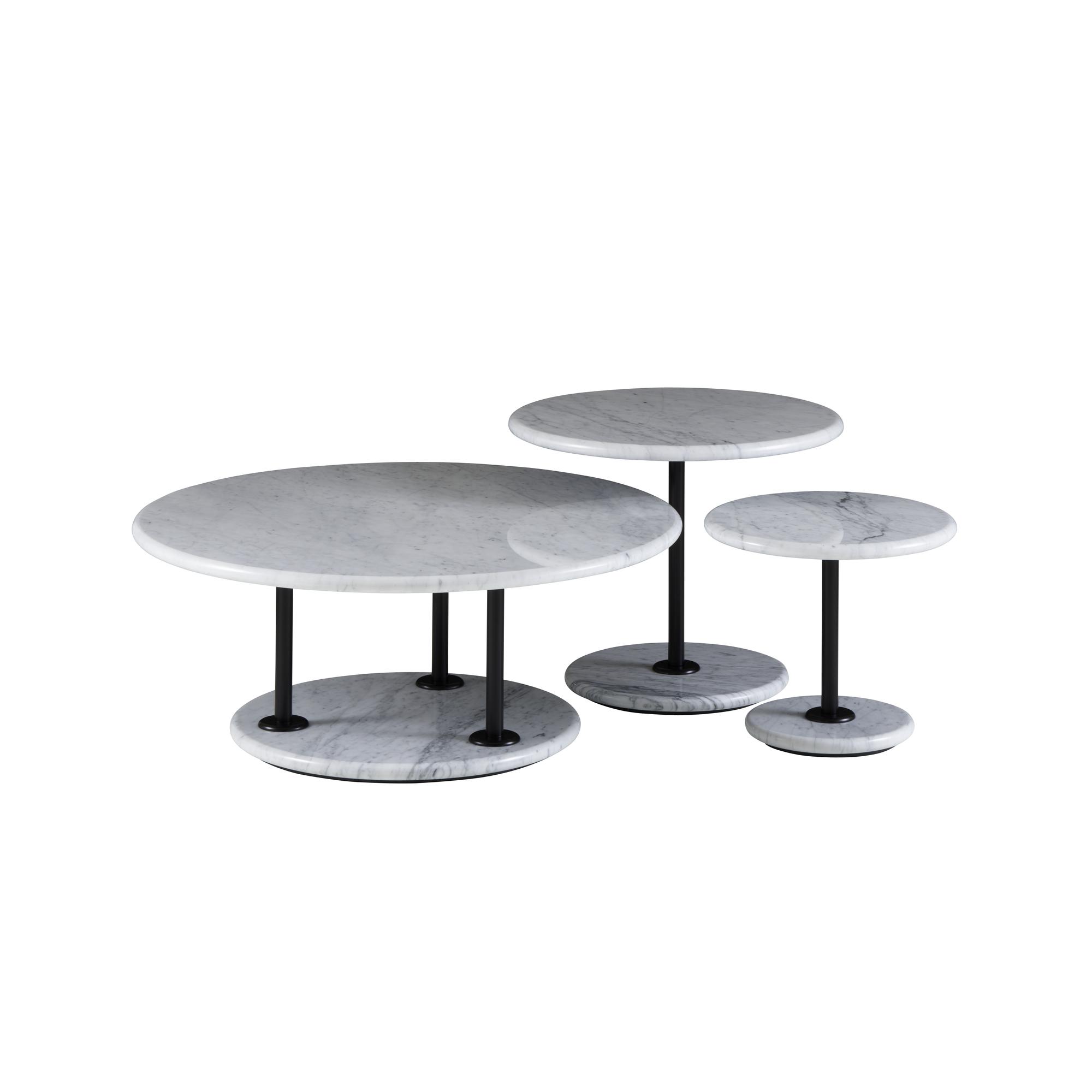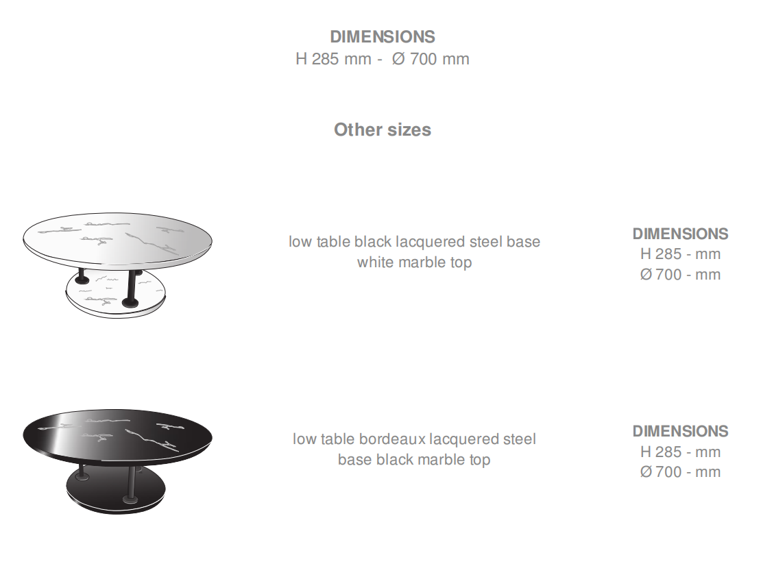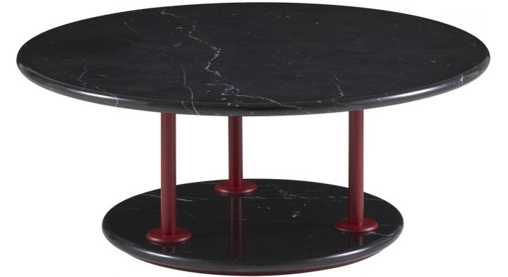 Low table with 3 stems made from black (RAL 9005) lacquered tubular steel set between the base and the white Carrara marble top (polished, with stain-resistant treatment). Low table with 3 stems made from bordeaux (RAL 3004) lacquered tubular steel set between the base and the black Marquina marble top (polished, with stain-resistant treatment).