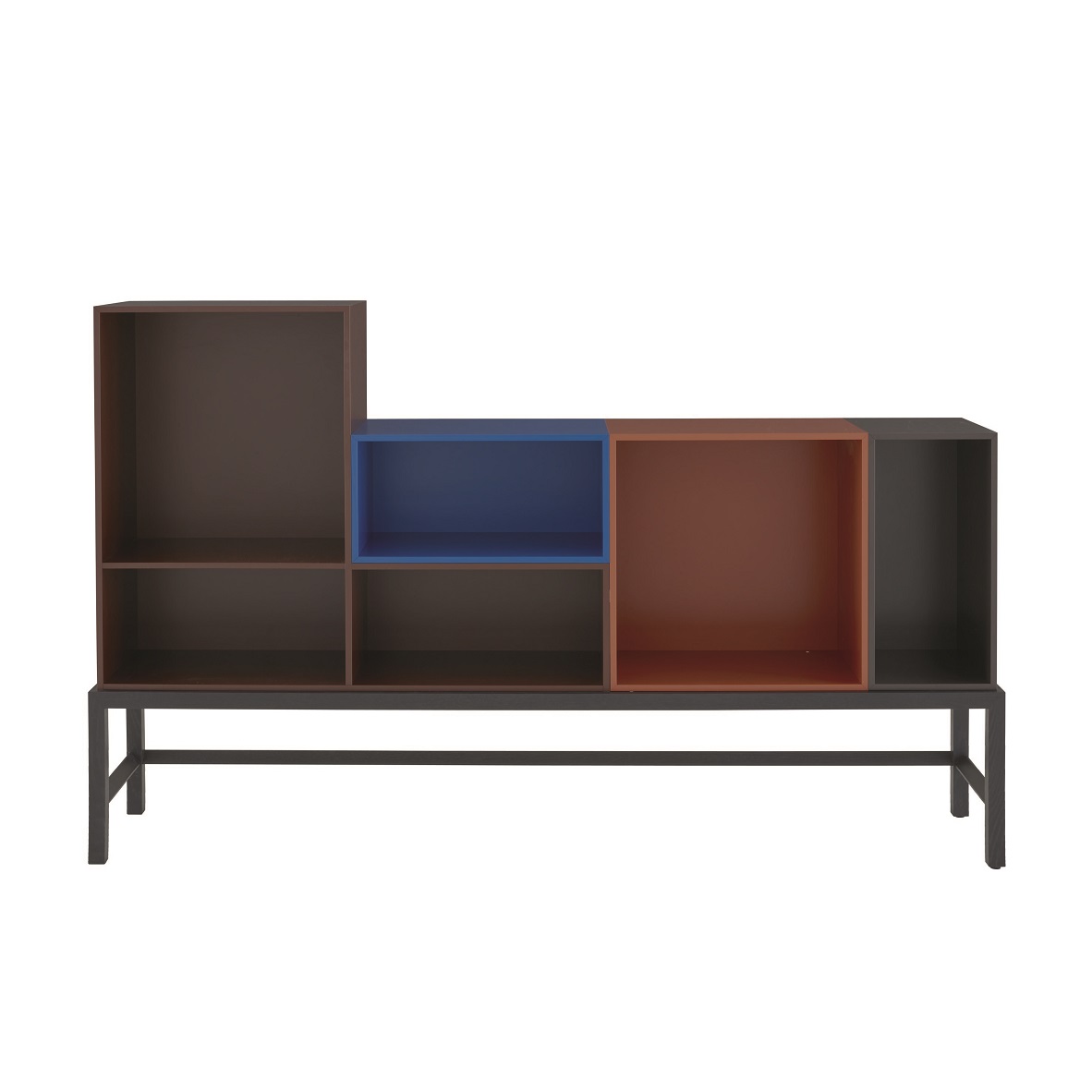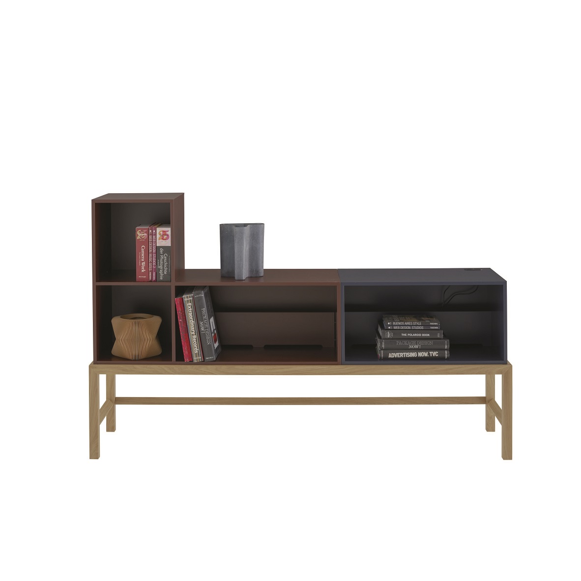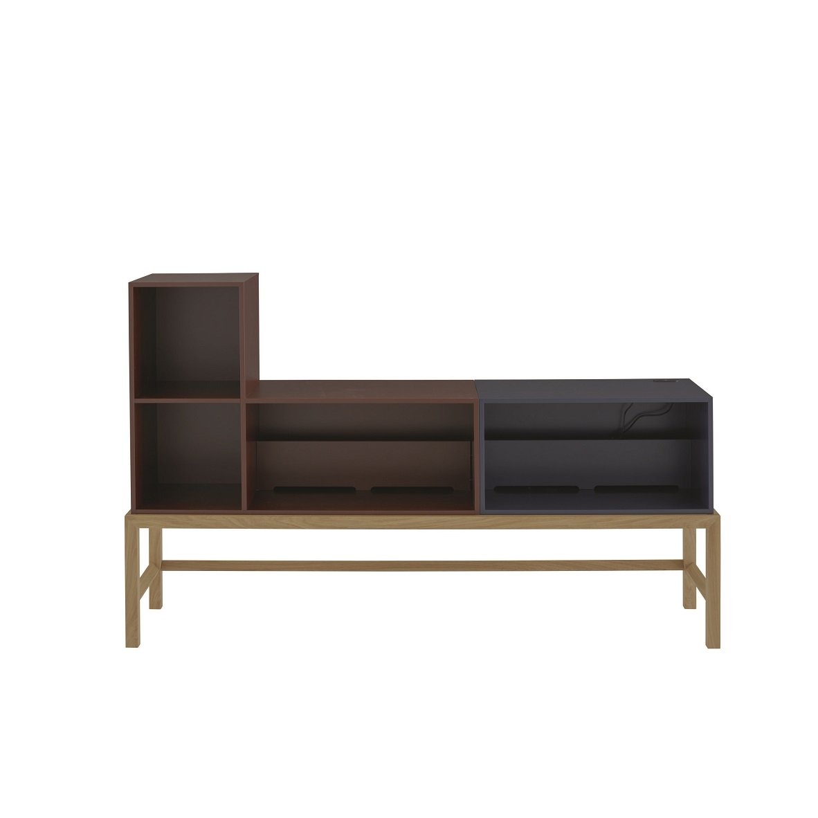紅磚是3種柜子(“ L”形,正方形和矩形)的完美結(jié)合。在這個(gè)搭建游戲中,不同的并排擺放或疊加擺放方式創(chuàng)建 了這個(gè)色彩斑斕的宇宙,看似雜亂無章,但又充滿布置者的心意。柜子之間必須有連接,并且已在工廠安裝;因 此,根據(jù)下表用戶訂購的是已經(jīng)預(yù)安裝的產(chǎn)品。 兩個(gè)主柜只有一種顏色,“ L”形紅木棕色,方形銅色。只有小矩形有4種顏色,可以進(jìn)行彩色游戲(巧克力色,鉑 金灰色,午夜藍(lán)色和龍膽藍(lán)色)。 柜子沒有隔板或內(nèi)部架子,因?yàn)榧兿涫浇Y(jié)構(gòu)可以增強(qiáng)柜子的強(qiáng)度。 組合家具有1530和1780兩種寬度,后者是前者加上一個(gè)垂直放置的附加矩形柜。 因此,根據(jù)上面的規(guī)則在網(wǎng)格上選擇所需的組合(A,B,D,E,F(xiàn)或G),并選擇所需的顏色。 底座由實(shí)心橡木制成,由家具制造商細(xì)心組裝,并由三角形的異形橫梁加固。底座雖輕巧卻牢固,前側(cè)面和后側(cè) 面由厚板連接,厚板前后處由兩塊不可見的金屬型材強(qiáng)化,從而保證產(chǎn)品的長(zhǎng)久使用。 另一件單獨(dú)的產(chǎn)品采用了1530寬度,為另外定制的柜子,可做電視柜。盡管柜子的高度降低了,但仍然極具現(xiàn)代 感。我們甚至在底部設(shè)計(jì)了兩個(gè)可移動(dòng)的后隔板,以隱藏多余的電纜。柜子底部與電纜收納處完美接合。矩形柜 子右上方裝有一個(gè)雙USB充電器,旁邊是一個(gè)帶有隱形感應(yīng)功能的筆記本電腦充電器(可選)。
