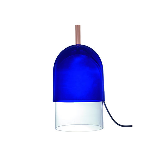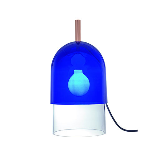 Table lamp composed of two glass elements which were mouth-blown in Ital, a bleu nuit-coloured textile cable and a copper-plated steel handle. When extinguished, the bulb is not visible. When lit, it appears through the now-transparent blue glass. – Table lamp in mouth-blown glass. Cylindrical base in transparent glass, ? 18.7 cm, visible height 9.3 cm, topped by a bell-shaped glass element in blue lacquered glass ? 20.8 cm H 21.5 cm. – A copper-plated steel handle ? 22 mm H 8.3 cm, fixed to the top of the blue glass element, enables this light to be moved if necessary. – Bleu marine-coloured textile cable. Black manual switch. – 7 W E 27 full glass LED globe bulb ? 80 mm, colour temperature 2,700K (warm white), 806 Lumens; ECL-approved. – Energy class A+ – Compatible with bulbs of energy classes E to A++.