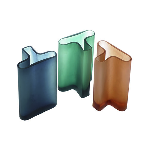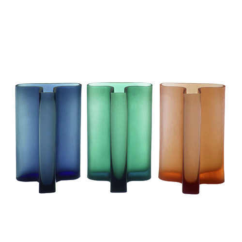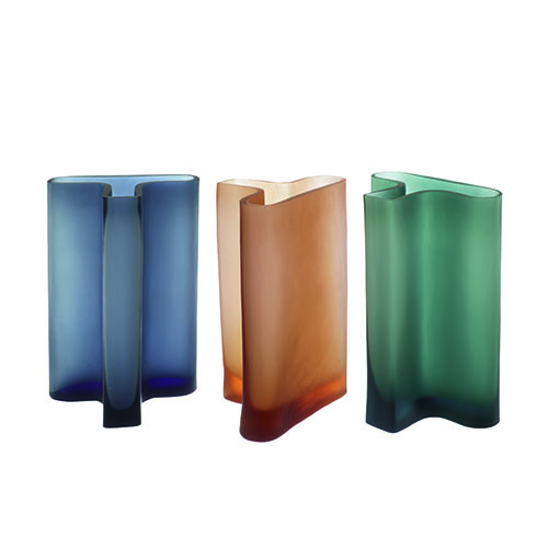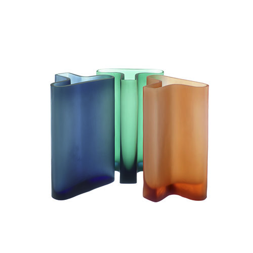 T花瓶是玻璃吹制后磨砂處理的高級手工藝作品。T花瓶的任意一邊可以用來握持花瓶,而全部三邊則可以用來支 撐和分散擺放花莖或花枝。這些花瓶可以放在一起,組成一個緊湊的組合,由于T花瓶提供3種柔和和諧的顏色, 易于組合,因此使得使用體驗更加有趣。 制作T花瓶需要兩年的工作,主要是因為制作過程復雜:需要一邊旋轉模具一邊將玻璃吹到平臺上。該技術需要很 高的靈活性,必須非??焖俚赝瓿刹僮?。零件冷卻后,需要手動刮擦以獲得朦朧的外觀。 靛藍,桃紅和灰藍三種顏色可供選擇,每件都很獨特。所有的花瓶都由制作者簽名。