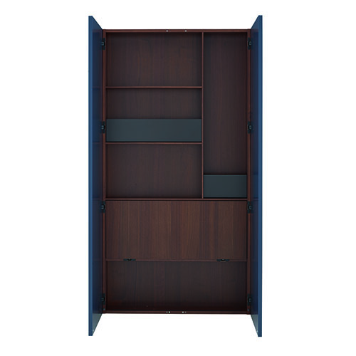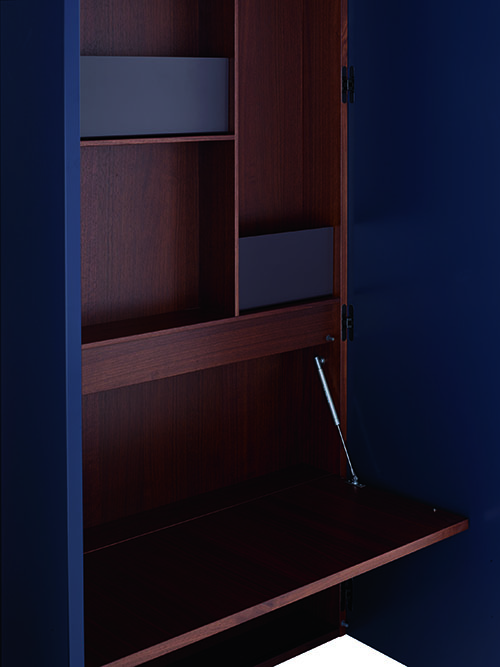 柜子:內部(底部、內壁、隔板、柜門內部、翻蓋)完全采用深色胡桃木貼面。 柜門:柜門有兩種款式: – 正面采用Steelcut Trio面料進行裝飾,內側采用胡桃木貼面。關門側的邊緣為單板,其他3個側面為黑色陽極氧 化鋁型材。 – 完全上漆,可選擇顏色(16種顏色)。