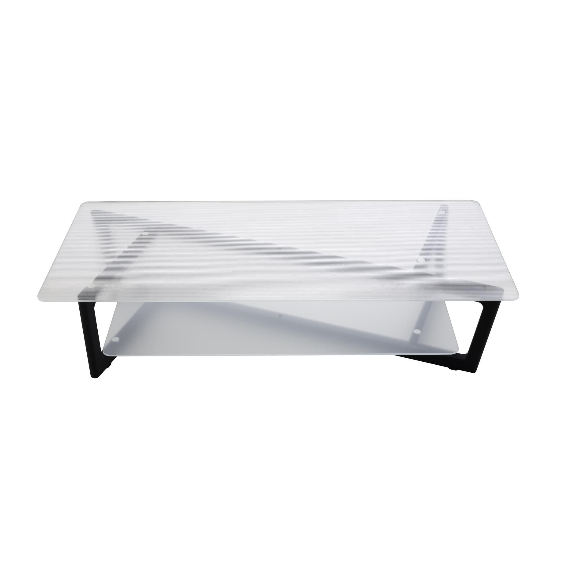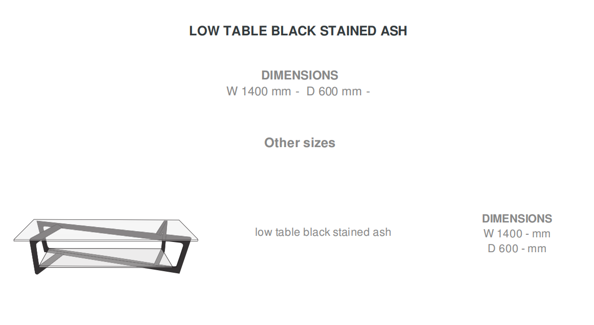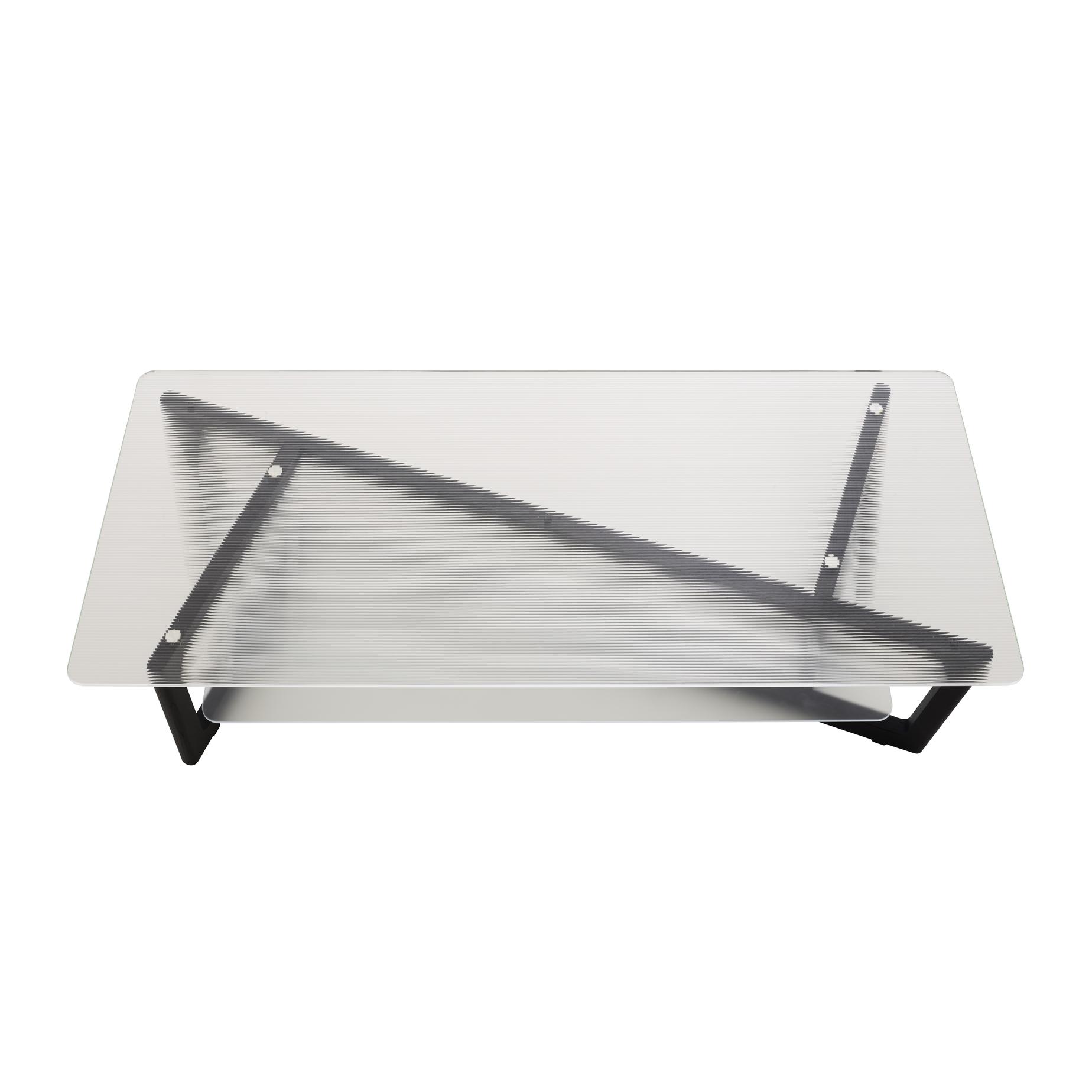 The totally new design springs from a rotational shift of the base and tops, moving the attention from the familiar to the unexpected. Here, it is the diagonal and not the right angle which directs the base of the Décalage low table: its basic use remains but the shape has changed and sends the gaze in a new direction. The moiré effect of the ridged glass enriches the perception of infinity, where everything appears to be sloping even though everything is straight. The 8 mm thick upper sheet of toughened glass is ridged with fine stripes ; the 6 mm thick lower glass is acid-frosted on its upper face (silky feel). The base is in black-stained solid ash, assembled at differing angles to achieve a purposeful, elegant shape. The juxtaposition of the two elements forms a unique pattern, the effect of which is further reinforced when viewed from above, amplifying the asymmetry.