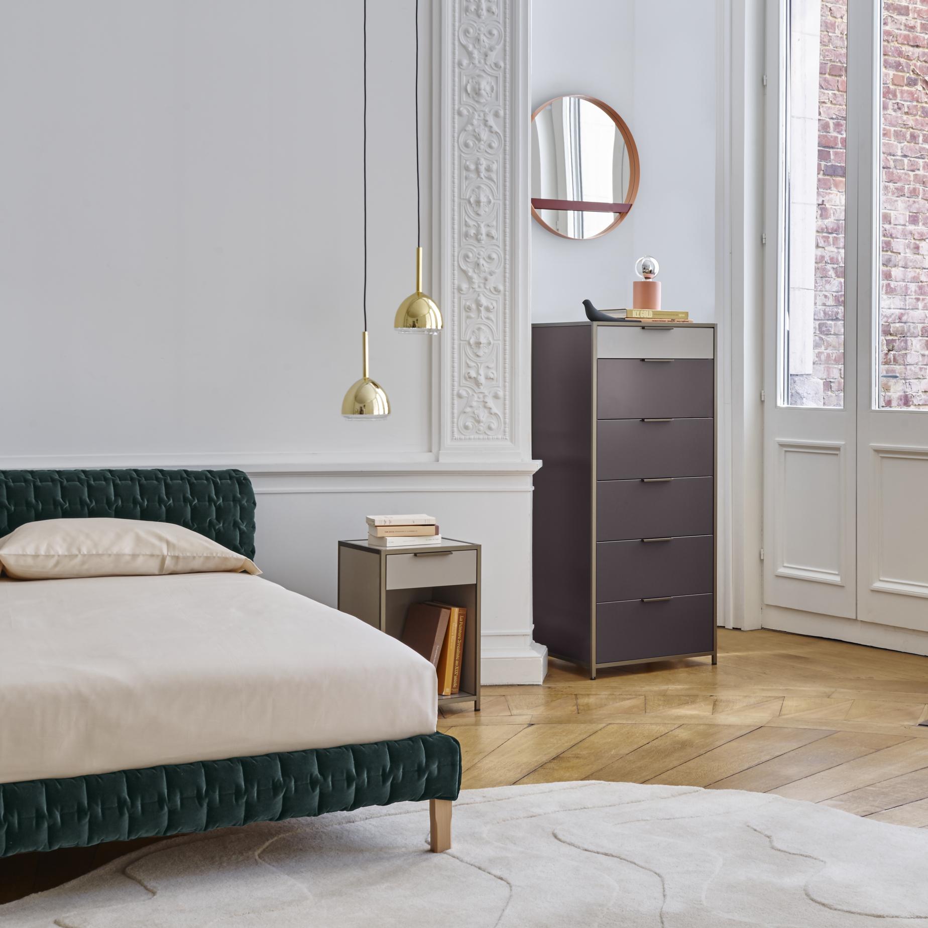 CONCEPTION : although it might be evocative of certain metal modular systems from the office world, Dita clearly distances itself from these in a number of ways: its lacquered panels are in wood rather than sheet metal; its discreet profiled uprights with their sophisticated finish are perfectly placed, cast and not part of the structure; a matching handle which is light and beautifully designed; and its small, slim feet which continue the line of the structure in a very natural way. QUALITY OF MANUFACTURE & FINISHES: uprights are in 15 x 15 mm anodised aluminium section in a brushed bronze finish. These frame the wooden panels which are finished in argile lacquer on the interior faces and in a choice of 16 colours for all visible exterior faces: - satin white, argile and perle (standard), - brique, bleu lavande, chocolat, moutarde, elephant, ranger, noir, bleu nuit, brun acajou, bleu gentiane, cuivre, gris platine (to order). All items are single-sided but are finished on the back (back panels and edges in argile lacquer). Certain items may be given an optional double- sided treatment, with the addition of a rear finishing panel. Handles are in injected zamak, lacquered bronze to co-ordinate with the uprights. Hinges are black. The feet H 30 mm continue the line of the uprights and incorporate a black jack. The new shelving unit, at H 189 cm the same height as the storage column, has shelves in a choice of 17 finishes: grey smoked glass, satin white/argile/perle lacquer, plus the 13 'to-order' lacquer colours (brique, bleu lavande, chocolat, moutarde, elephant, ranger, noir, bleu nuit, brun acajou, bleu gentiane, cuivre, gris platine). The 4-drawer chest is composed of 3 identical drawers topped with a narrower upper drawer. The 6-drawer chest is composed of 5 identical drawers topped with a nattower upper drawer. The bench/TV unit is available in 2 versions, either with a cushion or with a lacquered top. It comprises 2 flap doors with 2 lower glass shelves (could be used as hallway storage). The cushion in high resilience polyurethane Bultex foam 53 kg/m3 – 6.3 kPa is covered in Steelcut trio 3 (choice of 53 colours).