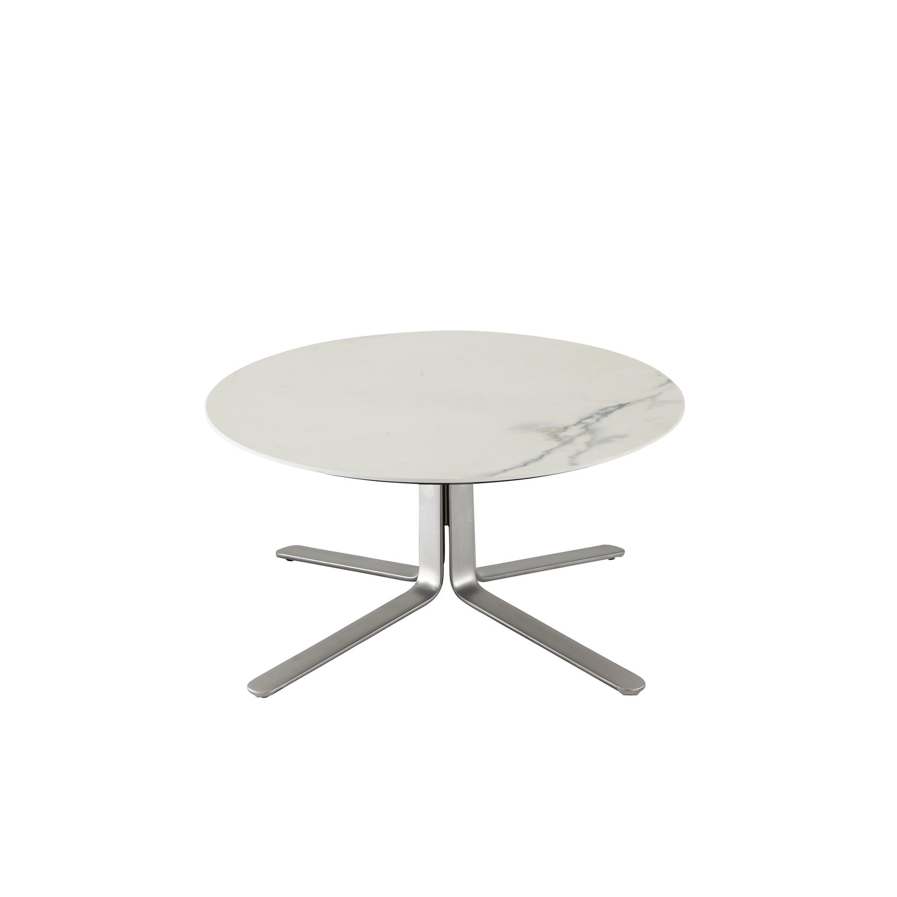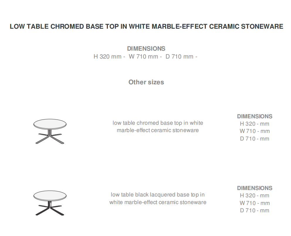 Fixed base identical to that of the footstool – metal finished in Epoxy satin black lacquer or satin-finish chrome. Top in black or white marble- effect ceramic stoneware.