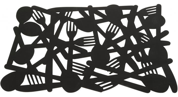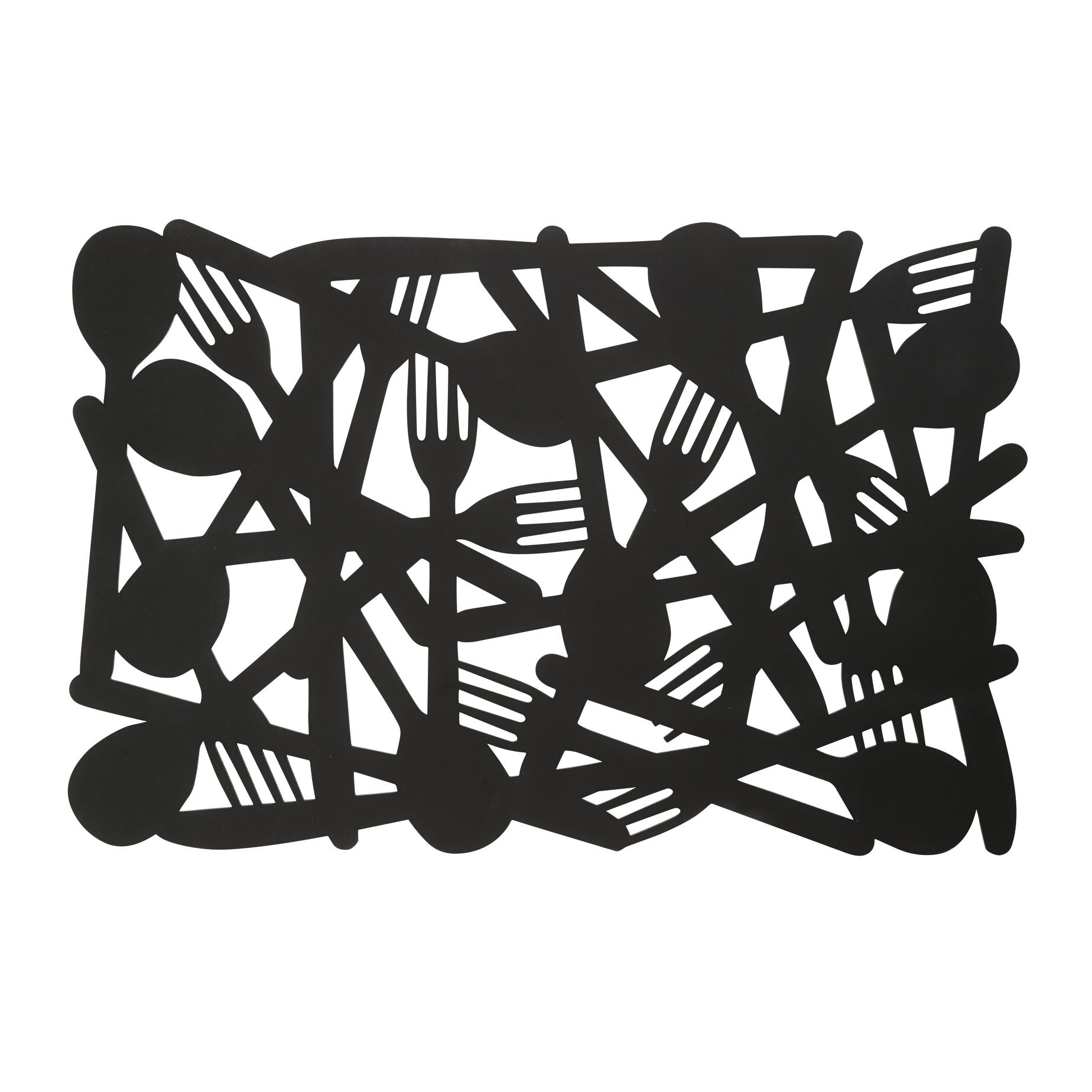 Placemats in black vinyl (71 % PVC / 25 % DINP plasticizer / 2 % pigments / 2 % others). Stamped cutout motif.
