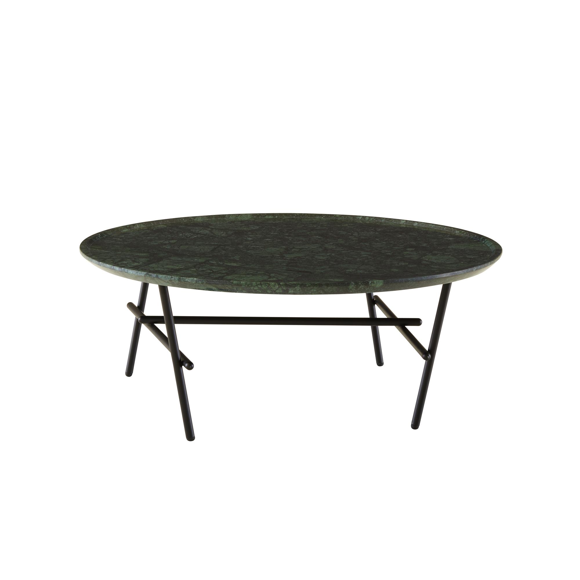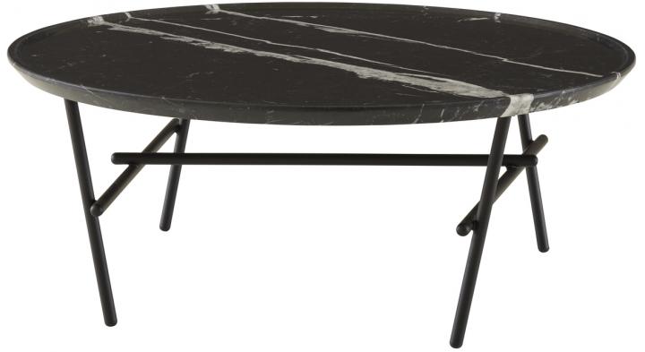 Making a play with the chaotic appearance of the steel structure of its base, the Yuragi table is at once simple and complex. Designed for indoor use, it is available with a top in verde Indian marble, marron Emperador marble or black Marquina marble. A modern, attractive design. The top is machined to obtain the border around the edge. Low table comprising a top (thickness 25 mm) in brilliant-polished marble with stain-resistant treatment and a satin black lacquered steel base with black semi-spherical gliders.