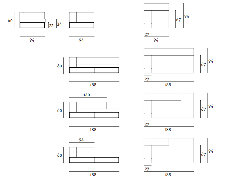 Elements with different sizes and armchair with armrest and back structure in double-panelled poplar and pine with padding in differentiated density polyurethane foam. Covering in needle punched, resinated, nonwoven polyester fibre, bonded onto a polyamide velveteen backing. Under-seat panel in self-supporting decorative HPL, plastic laminate panel, decorated on both sides. Seat cushions with preformed, differentiated density polyurethane foam, covered with acrylic fibre layers. Base in AISI 304 stainless steel square-section tube, with matt satin-finish. Fabric or leather upholstery, both fully removable by zippers and Velcro fastenings. Seat depth 67cm. Ile has undergone and passed the seat and back static load and fatigue tests (EN 1728:2000), with issue of relative certificate by CATAS?.