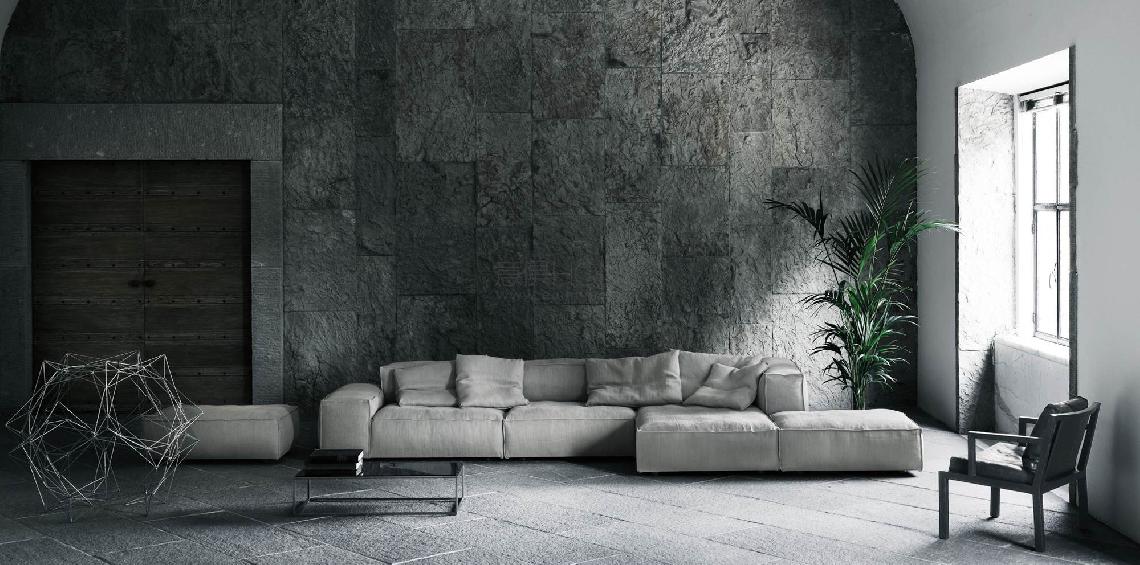 Different modular elements. Frame in double-paneled poplar and pine. Cross-woven, coated rubber elastic straps. Padding in differentiated density polyurethane foam covered with a quilted mat in prewashed and sterilized goose down, stitched into separated compartments or in differentiated density polyurethane foam and visco-soft “Xtra-pur” covered with acrylic fibre layers. Black adjustable PVC feet or in stainless steel, with matt satin-finish. Fabric or leather upholstery, both fully removable by Velcro fastenings. The various elements are joined together by means of hooks. Seat depth 68-94cm.