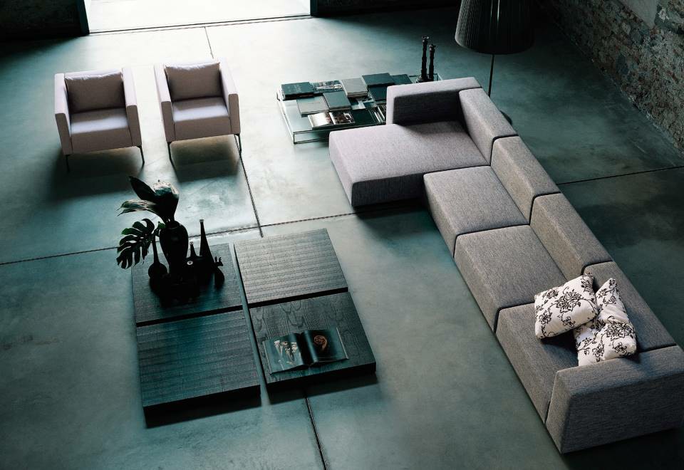 Modular elements of different sizes with frame in double-panelled poplar and pine. Support in cross-woven, coated rubber elastic straps. Padding in differentiated density polyurethane foam. Covering in needle punched, resinated, nonwoven polyester fibre, bonded onto a polyamide velveteen backing. Black adjustable PVC feet (Wall) or base in AISI 304 stainless steel with matt satin-finish (Wall2). Fabric or leather upholstery. The fabric version only is fully removable by Velcro fastenings. The various elements are joined together by means of hooks. Seat depth 68-94cm.