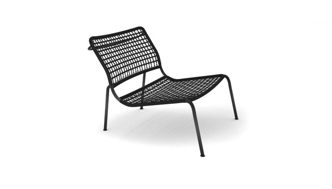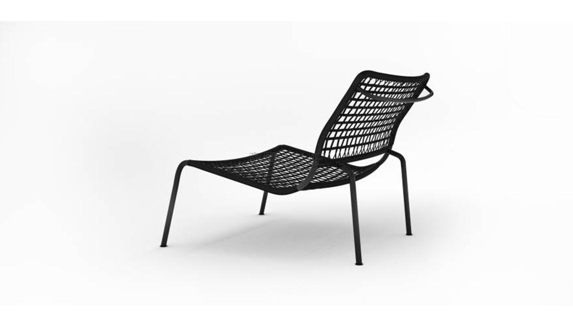 Woven armchair available for indoor and outdoor. Supporting frame in carbon fiber obtained by aluminum molds, developed with tubular parts with a thickness ranging from 2 to 3mm, hand-shaped with multi-axial and unidirectional fabrics, overlapping orthogonally, and reinforced in the areas of greatest stress. The structure has undergone a polymerization cycle in an autoclave at high temperature at constant pressure to ensure structural rigidity and significantly lighten the weight. Finish with polished transparent, red paint, RAL-K7 3007 Black Red, RAL-K7 7022 Umbra Grey or RAL-K7 5011 Steel Blue. Woven with black, red, bordeaux, gray or blue flat polyester cord. Seat depth 51cm.