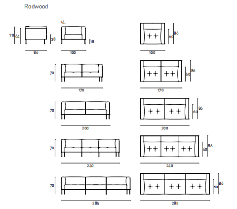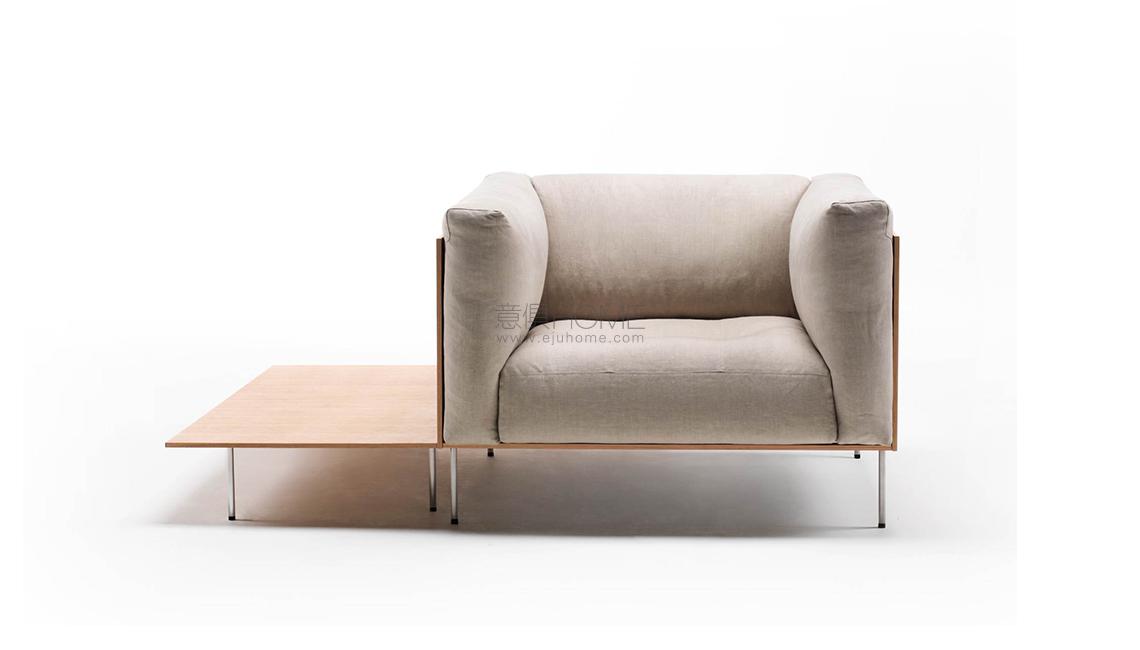 Sofa and armchair. Supporting structure in lacquered drawn tubular steel, seat sprung with coated rubber elastic straps. Backrest and armrest structure in 10mm HPL panel, veneered with heat-treated oak plates with water-based acrylic paint finish. Back and seat cushions in prewashed and sterilized goose down, with polyurethane foam insert. The seat cushions are quilted with buttons at sight or, on request, quilted without buttons. Armrest cushions in polyurethane foam covered with prewashed and sterilized goose down, with a poplar plywood supporting panel fixed to the frame by plug-in hinges. Stainless steel feet, polished or matt-satin finish, screwed to the base with a bushing. Fabric or leather upholstery, both fully removable by zippers and Velcro fastenings. Seat depth 60-80cm.