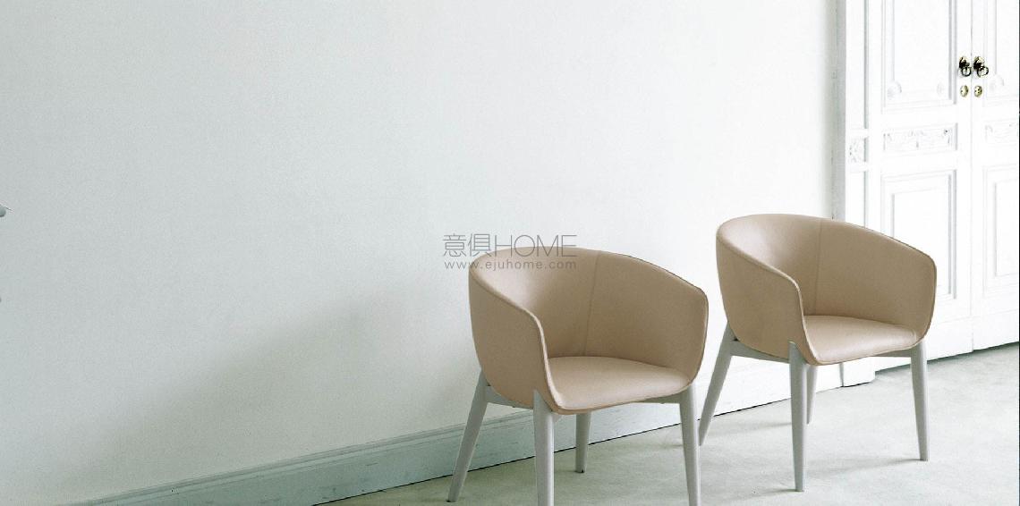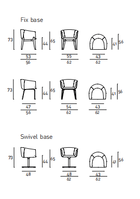 Armchair with one- piece frame with steel insert and flexible, cold-expanded polyurethane foam padding. Covering in 100% polyether thermally bonded onto a polyamide velveteen backing. Base with elliptical turning legs, in ash wood natural, ebony or walnut dyed. Armchair also available with polish stainless steel swiveling base or with fix base in square-section 15x15mm AISI 304 stainless steel tube with matt satin-finish. Fabric or leather upholstery, both fully removable by zippers and Velcro fastenings. Seat depth 41cm.