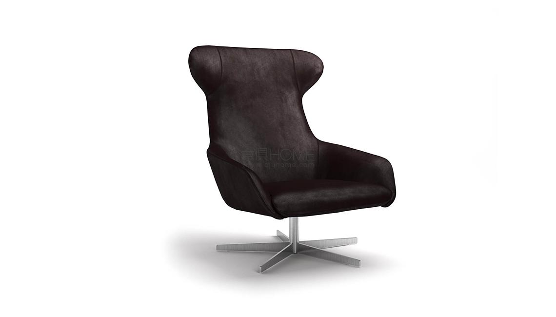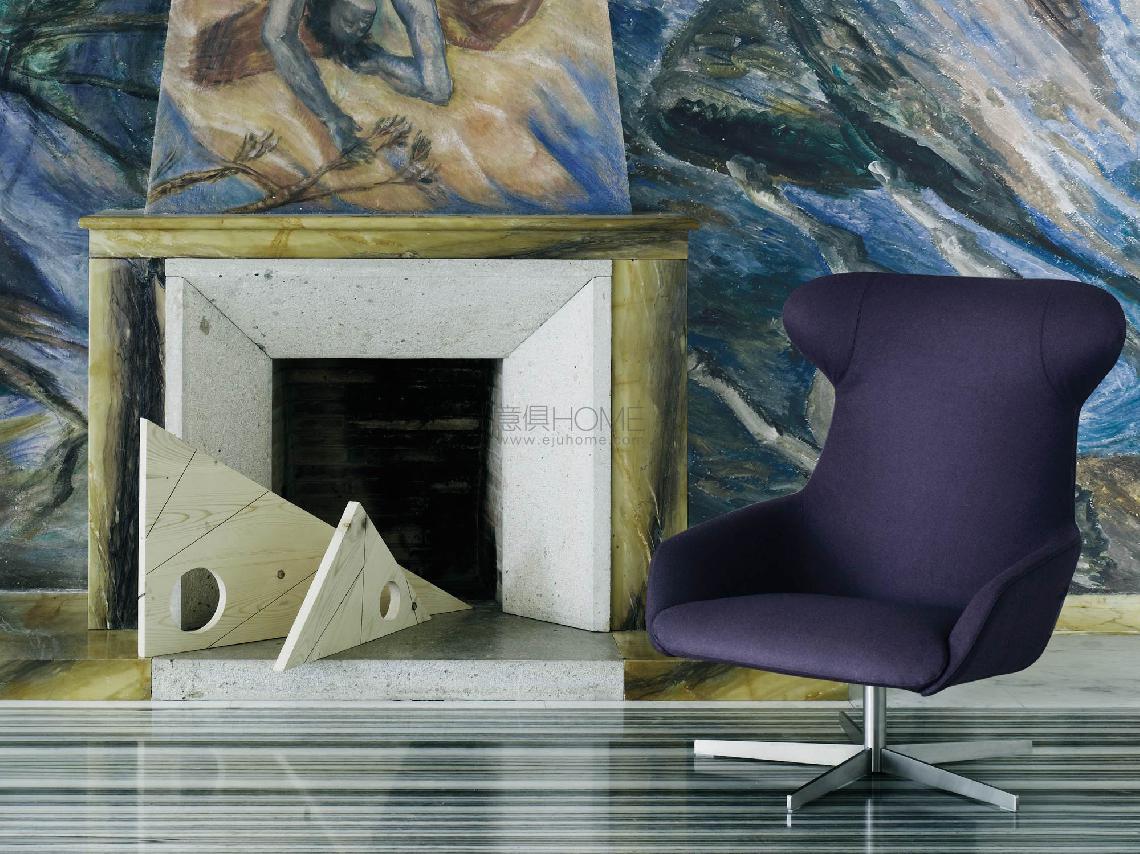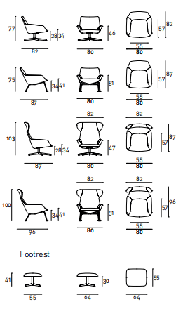 Armchair, bergère and footrest with steel frame embedded in cold-expanded polyurethane foam with Visco-soft “Xtra-pur” insert and seat support in cross-woven, coated rubber elastic straps. Covering in needle punched, resinated, nonwoven polyester fibre, bonded onto a polyamide velveteen backing. Swivelling or fix base, in AISI 304 stainless steel matt satinfinish or, for swiveling version only, in black epoxy powder coating. Fabric or leather upholstery, the fabric version only is fully removable by zippers and Velcro fastenings. Seat depth 57cm.