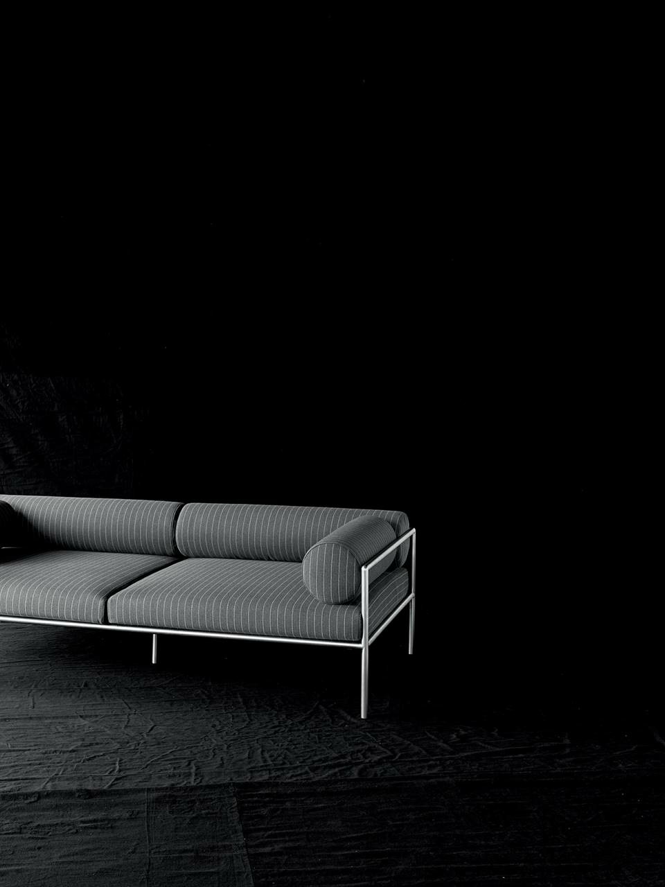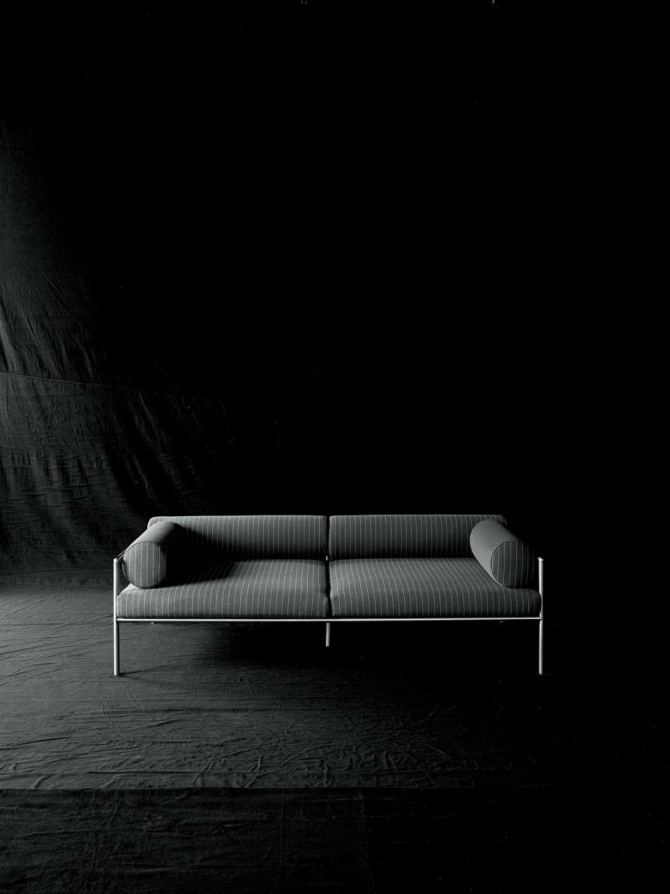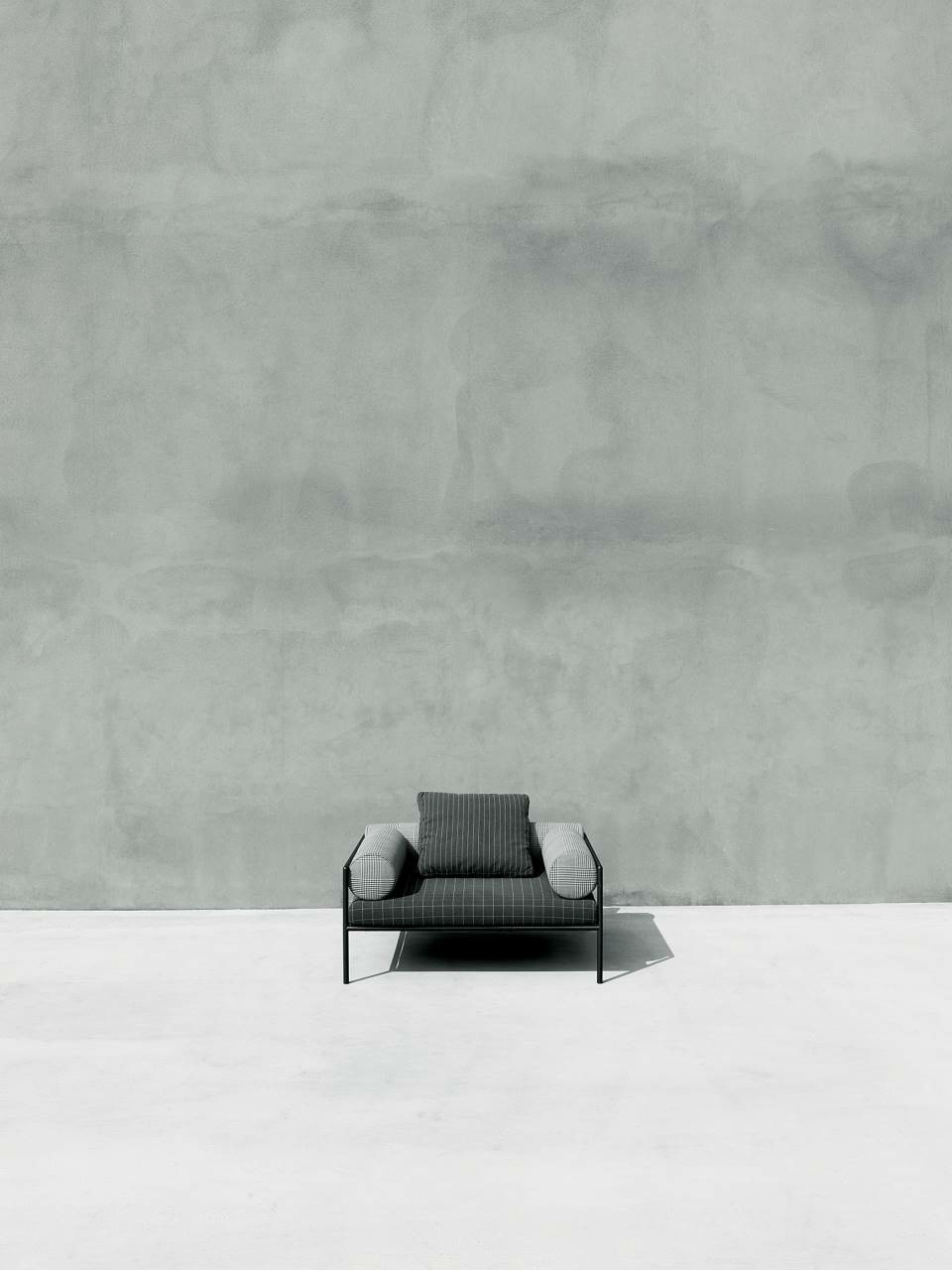 Armchair, sofas and day bed available for indoor and outdoor, both in the “Light” version - structure only - or with weaving in the materials available in the collection. Indoor version: tubular steel frame ?25mm with epoxy powder coating gunmetal color, woven with full background motif, warp and weft, in cellulose cord. Seat chassis in tubular steel, section 40x30mm, with epoxy powder coating, screwed to the structure, sprung with coated rubber elastic straps with padding in polyurethane foam covered in 100% polyether thermally bonded onto a polyamide velveteen backing. Seat cushions, in different density polyurethane foam, and bolster cushions for backrests and armrests, in polyurethane foam, covered with acrylic fiber layers. Leather or fabric upholstery. Outdoor version: tubular frame ?25mm in Stainless Steel AISI 316 with matt satin finish or with a galvanizing base for outdoor with epoxy polyester powder coating gunmetal color, woven in waxed rope (? 5mm) in the finishing available in the collection. Seat chassis, screwed to the frame, in 40x30mm Stainless Steel, sprung with coated rubber elastic straps, with stainless steel hooks. Padding with open-cell structure polyurethane foam DRYFEEL S and fibre for outdoor, coated with heat- sealed waterproof fabric protection. Seat cushions and bolster backrests and armrests cushions, padded with open cell structure polyurethane foam DRYFEEL S and fibre for outdoor, covered with heat- sealed waterproof fabric. Upholstery with outdoor fabrics only. For both versions, upholstery fully removable by zippers and Velcro fastenings. Floor support secured by black PVC feet