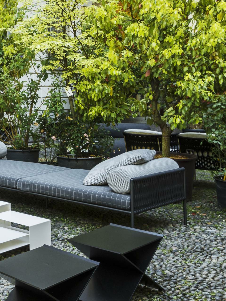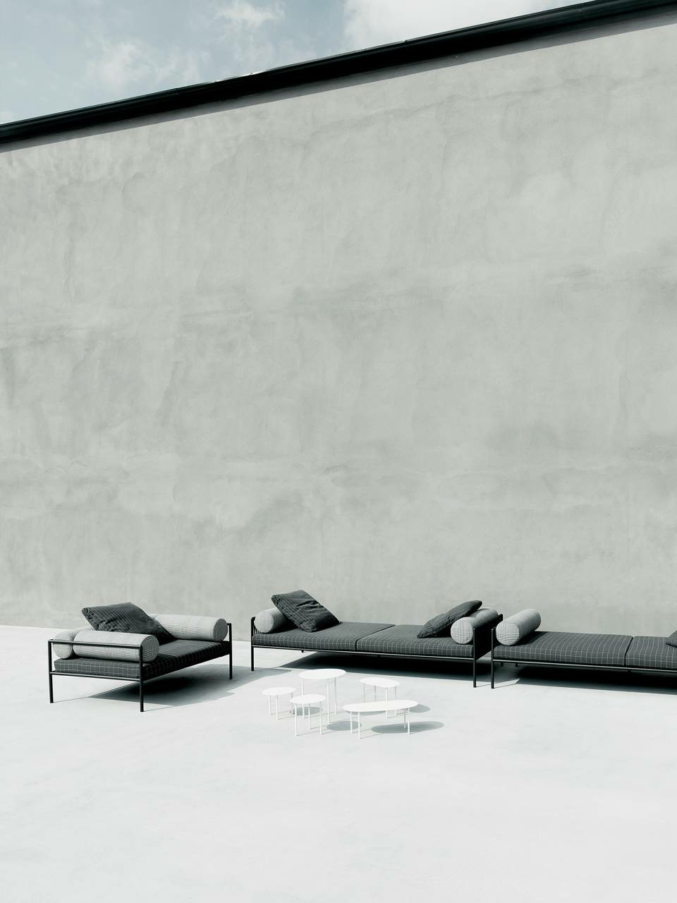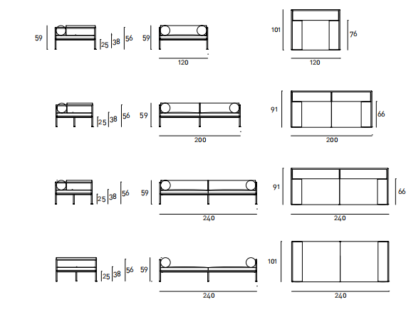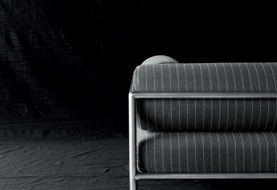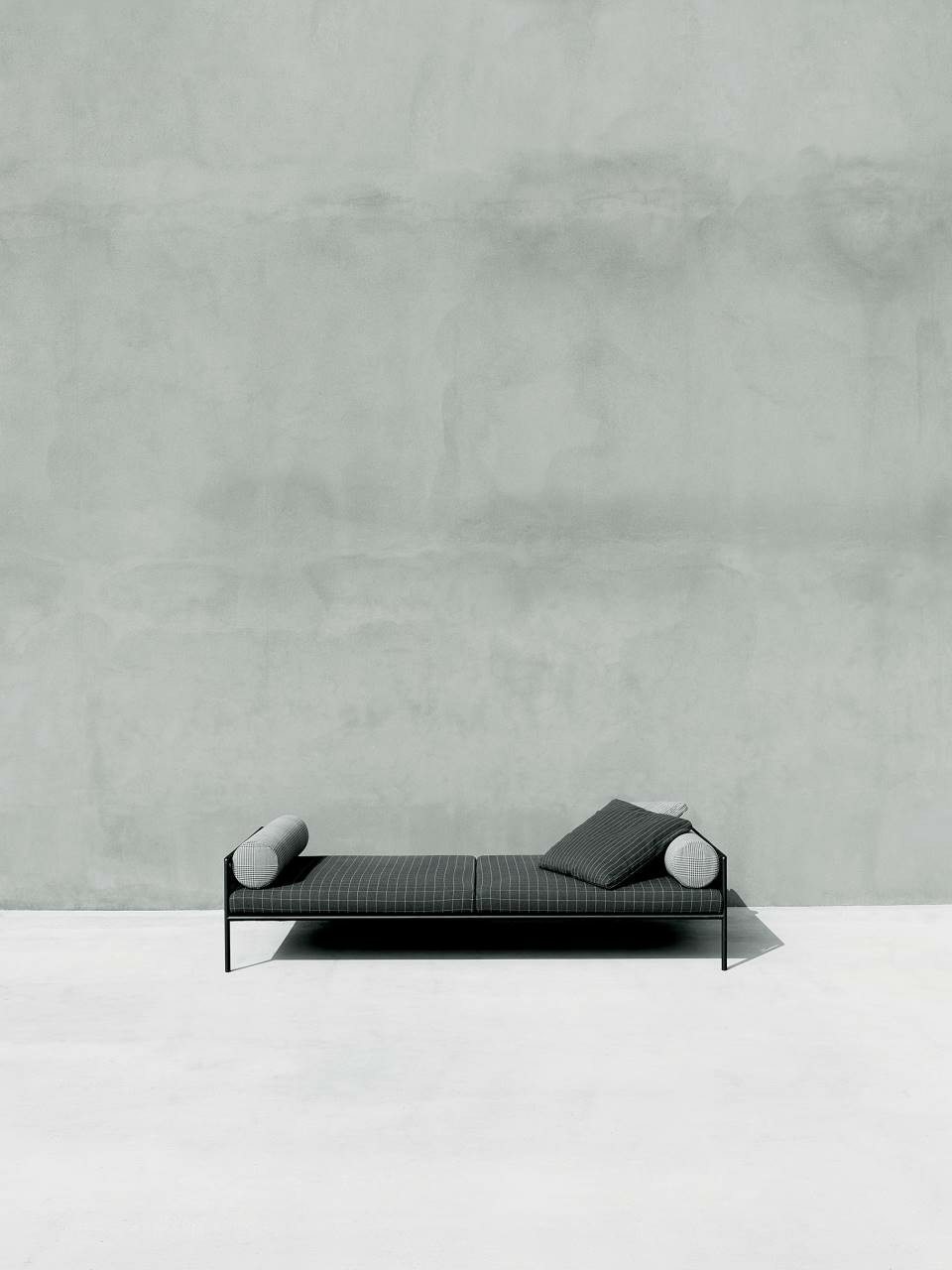 Armchair, sofas and day bed available for indoor and outdoor, both in the “Light” version - structure only - or with weaving in the materials available in the collection. Indoor version: tubular steel frame ?25mm with epoxy powder coating gunmetal color, woven with full background motif, warp and weft, in cellulose cord. Seat chassis in tubular steel, section 40x30mm, with epoxy powder coating, screwed to the structure, sprung with coated rubber elastic straps with padding in polyurethane foam covered in 100% polyether thermally bonded onto a polyamide velveteen backing. Seat cushions, in different density polyurethane foam, and bolster cushions for backrests and armrests, in polyurethane foam, covered with acrylic fiber layers. Leather or fabric upholstery. Outdoor version: tubular frame ?25mm in Stainless Steel AISI 316 with matt satin finish or with a galvanizing base for outdoor with epoxy polyester powder coating gunmetal color, woven in waxed rope (? 5mm) in the finishing available in the collection. Seat chassis, screwed to the frame, in 40x30mm Stainless Steel, sprung with coated rubber elastic straps, with stainless steel hooks. Padding with open-cell structure polyurethane foam DRYFEEL S and fibre for outdoor, coated with heat- sealed waterproof fabric protection. Seat cushions and bolster backrests and armrests cushions, padded with open cell structure polyurethane foam DRYFEEL S and fibre for outdoor, covered with heat- sealed waterproof fabric. Upholstery with outdoor fabrics only. For both versions, upholstery fully removable by zippers and Velcro fastenings. Floor support secured by black PVC feet