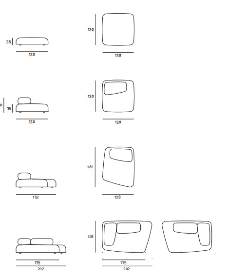 One-piece frame in marine plywood, springs with woven elastic straps of covered rubber, black adjustable PVC feet. Padding in polyurethane foam for outside use. Fabric upholstery only. Covers can be completely removed.