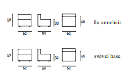 Small armchair available for indoor and outdoor. Indoor: seat frame in plywood, back panel in steel. Padding in differentiated density polyurethane foam. Covering in 100% polyether thermally bonded onto a polyamide velveteen backing. Fabric or leather upholstery. Outdoor: seat frame in marine plywood, back panel in steel. Padding in fine cell polyethylene. Upholstery with outdoor fabrics only. Both versions with black PVC feet or, on request, available on wheels and fabric upholstery only, fully removable by zipper and Velcro fastenings. Seat depth 46cm.