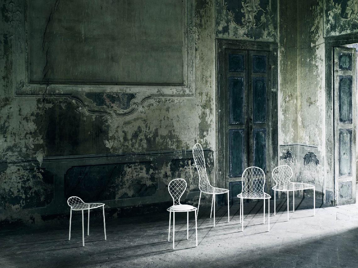 Collection of 5 different steel chairs. Structure in 12mm tubular steel, curved using a numeric control machine and 15mm tubular steel legs welded together using internal reinforcement. The seat mesh is in 3mm steel wire with a 40x40mm diagonal weave, individually rolled for each seat. Finished with epoxy paint in the colour RAL 9010-white or electro-coated in the outdoor version. For colours on request refer to RAL-K7 card. Seat cushions available in customized dimensions for each chair in seat-only or seat-and-back versions. Padding in polyurethane covered with acrylic fifibre layers, covers fully removable. For outdoor version, covers and padding only with outdoor materials.