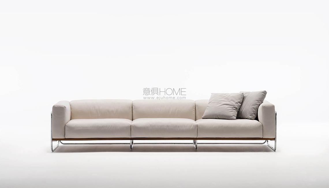Armchair and sofa with frame in curved tubular ?22mm Stainless Steel AISI 316 with mat satin finish or with epoxy polyester powder coating RAL-K7 9010 white or RAL-K7 9017 black. Seat panel with slats in kiln-stabilized solid Iroko wood, 28mm thickness, treated with a highly UV protective oil. Seat, backrest and armrests cushions in open cell structure polyurethane foam DRYFEEL S, covered with fibre for outdoor and with a waterproof fabric. Upholstery with outdoor fabrics only, fully removable by zippers. Seat depth 56cm