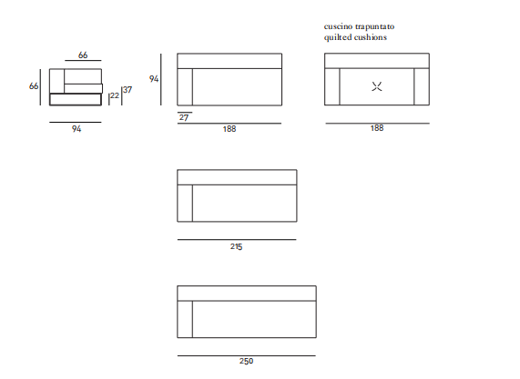Armrest and back structure in double-panelled poplar and pine, with visco-sof “Xtra-pur” polyurethane padding covered with a layer of prewashed and sterilized goose down or covered with acrylic fifi ber layers. Base in matt, satin-fifi nish, AISI 304 stainless steel, square-section tube. Seat with painted steel frame and sprung base with coated rubber elastic straps. Seat cushion in visco-sof “Xtra-pur” polyurethane, covered with a layer of prewashed and sterilized goose down or covered with acrylic fifi ber layers. Leather or fabric covers, both fully removable. Seat depth 66-94cm. Quilted also available on request.