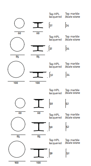Table in different heights and sizes, available for indoor  and outdoor. Indoor: 4 legs base in chromed-plated steel or AISI 316  stainless steel with matt satin-finish. Top in decorative  multi-layer HPL, decorated on both sides, white or black;  in MDF white or black lacquered; in white Carrara marble,  black Marquinia marble or Slate stone.  Outdoor: 4 legs base in AISI 316 stainless steel with matt  satin-finish. Top in decorative multi-layer HPL decorated  on both sides, white or black, or Slate stone.  In both versions, the base for tops ?85cm or ?100cm  with 72/74cm height has 5 legs.