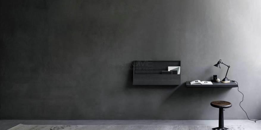 Space-saving desk, wall mounted through a 5mm steel-sheet plate to which are welded two clasps that act as inset for the mechanism’s steel bar, embedded in the desk, and allow fixing and adjustment. Top frame made in “Folding”, side panels and internal partitions in 10mm birch plywood, veneered with oak plate, natural, charcoal dyed, or Stone Oak? with water-based acrylic paint finish. Bottom / rear side in solid oak, with embedded the aluminum mechanism connected on the steel bar with a gas lift piston, allowing a 90° rotation to change function from desk to magazine rack.