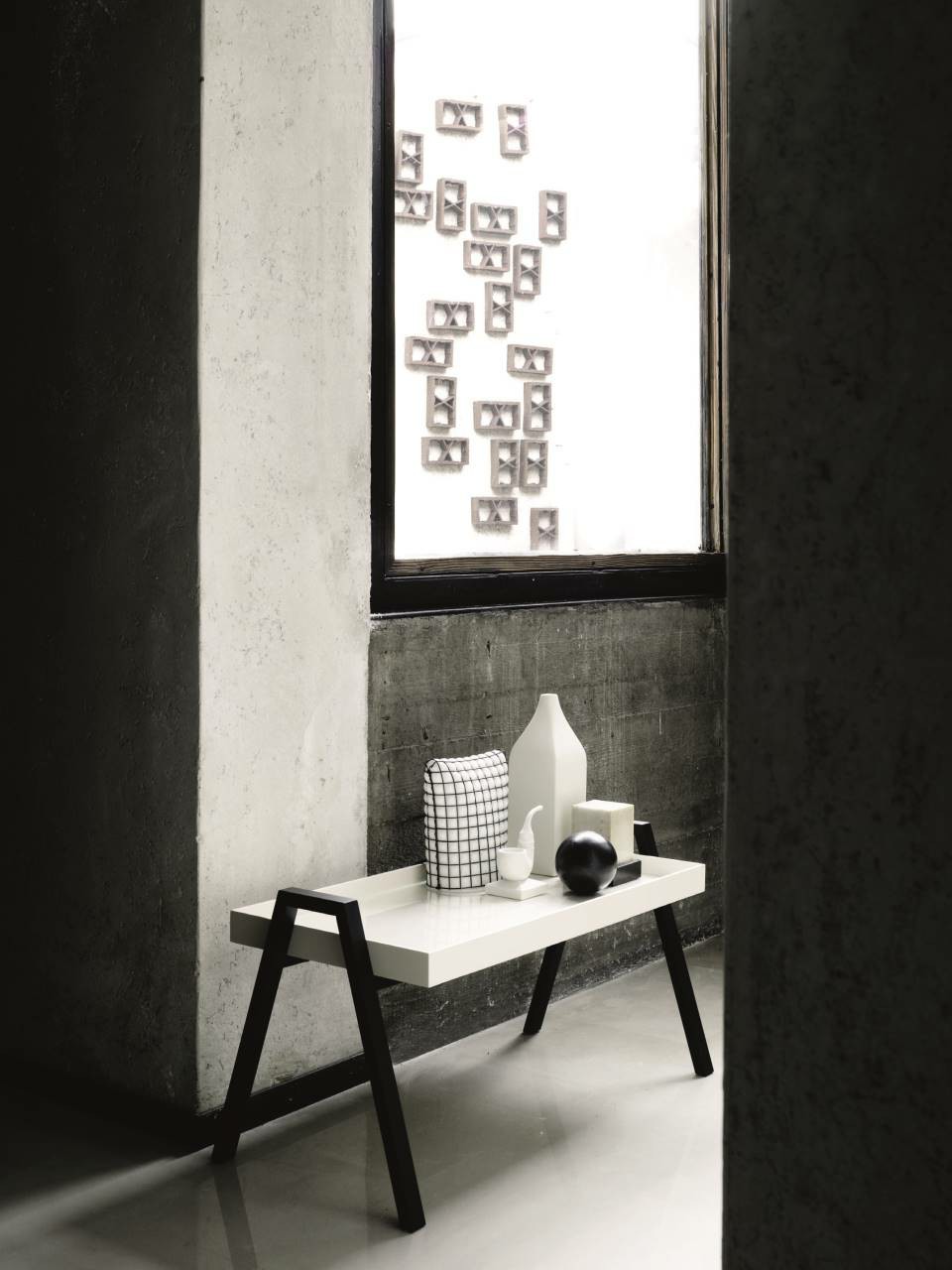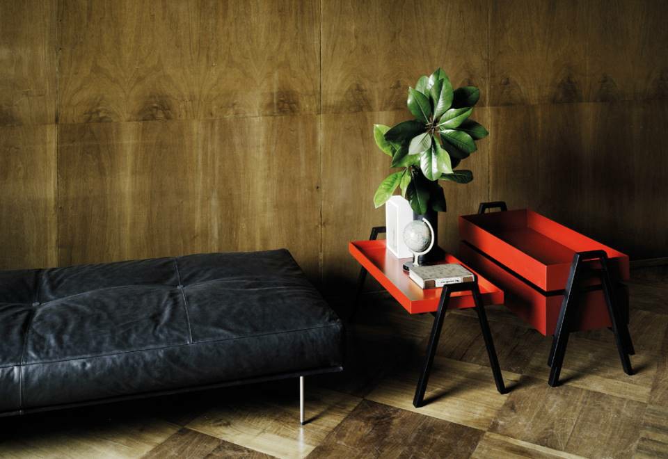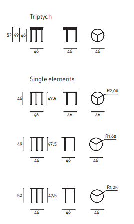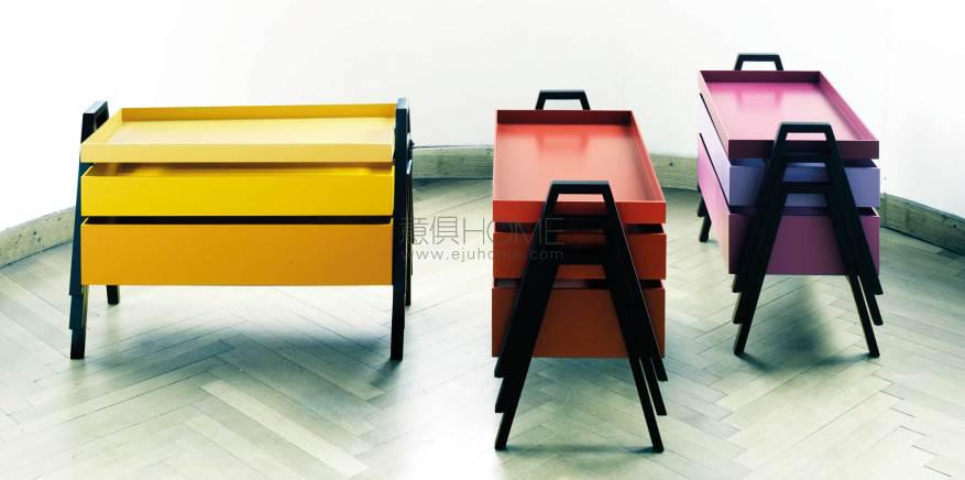 Table consisting of 3 stackable trays of different heights. Legs in black lacquered phenol birch plywood. Trays in 6mm lacquered birch wood plywood, fixed to each base. Available in 4 configurations, each of 3 colours: RAL 1034 Pastel yellow RAL 1037 Sun yellow RAL 2000 Yellow orange RAL 3003 Ruby red RAL 3004 Purple red RAL 3005 Wine red RAL 4004 Claret violet RAL 4005 Blue lilac RAL 4006 Traffic purple RAL 9001 Cream RAL 1013 Oyster white RAL 9002 Gray white