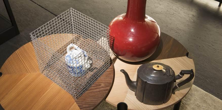 Set of 3 stackable tables with supporting frame in matt black epoxy powder coating RAL-K7 9017 and wooden tops. Each table features a 15mm thick MDF top veneered in three different combination of wood through inlay work, with waterbased acrylic paint finish. Base consisting of 3 legs in laser-cut tube’s section (?25/32/40mm) welded to the laser cut 5mm thick steel sheet under top frame. Black plastic foot tips inset in the legs. Dimensions: 1- diameter 46cm: h46, wood types: Thermo chestnut, chestnut, elm. 2- diameter 46cm: h49, wood types: Thermo larch, Thermo oak, Thermo douglas fir. 3- diameter 46cm: h52, wood types: Thermo acacia, Thermo eucalyptus, Thermo chestnut.