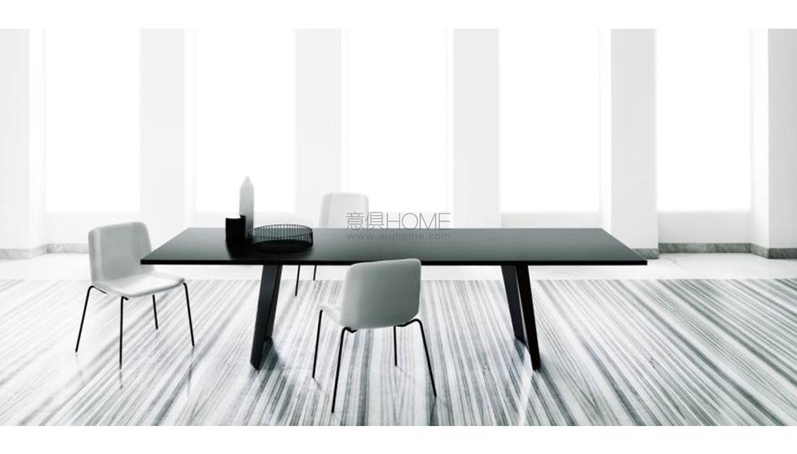 Rectangular dining table available for indoor or outdoor. Indoor version: wooden table consisting of a double-paneled top of 40mm, in balanced fir wood, reinforced by steel tubulars of 25x15mm, veneered with 10/10 plates and edged with solid wood of 4mm on the perimeter. Legs in multilayer birch veneered with 10/10 plates. Finishing in natural chestnut, charcoal dyed chestnut or Stone Oak? with water-based acrylic paint finish. Legs screwed to the top by steel plates finished with polyurethane lacquer. Indoor/outdoor version: aluminum table consisting of a top in 28mm alveolar aluminum completed with a 1mm aluminum-sheet with folding finishing and legs in 5mm alveolar aluminum panels with folding finishing. Primer for aluminum and outdoor polyurethane lacquer in RAL-K7 9010 white or 9017 black, or “concrete effect” finish col. Chiaro or col. Scuro. Legs screwed to the top by steel plates finished with outdoor polyurethane lacquer.