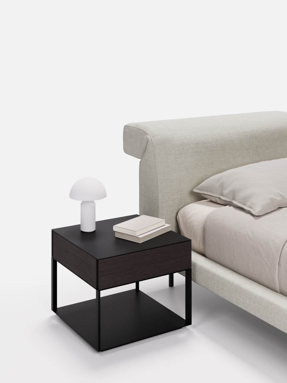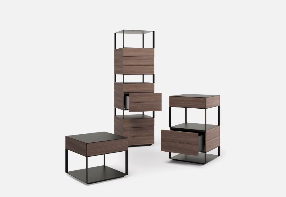 A square base creates a structure that intersperses a landscape of solids and voids, culminating in a practical shelf together with intimate and discreet drawers, disguised by the outer surface.
