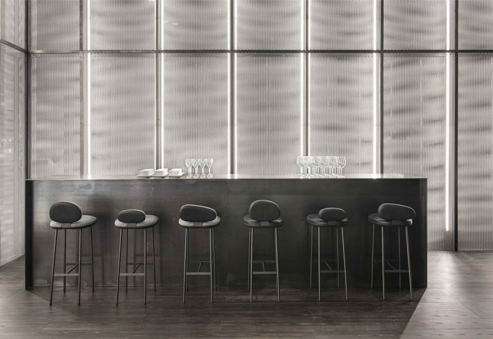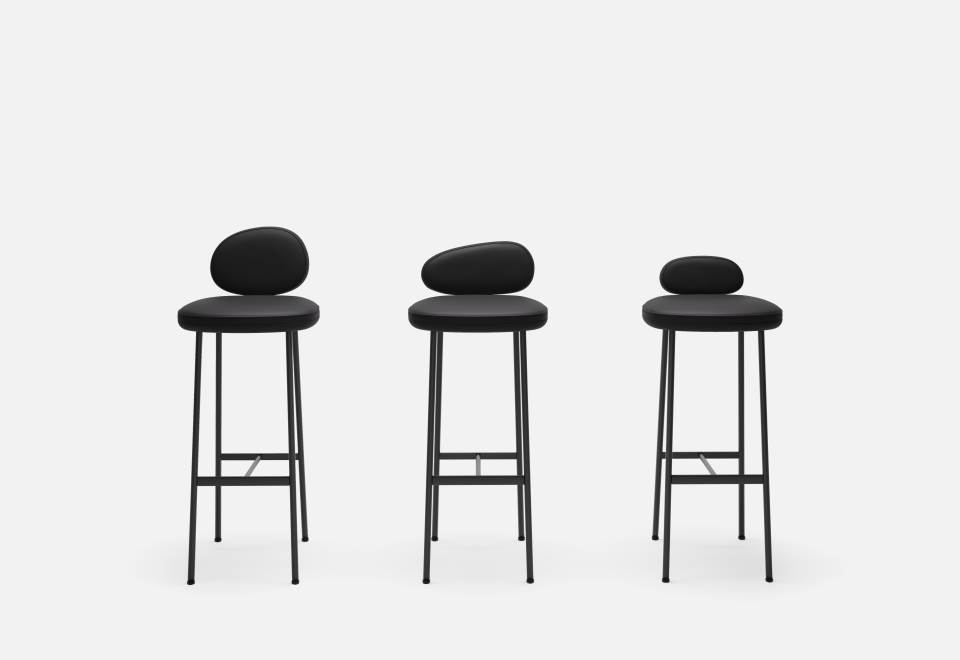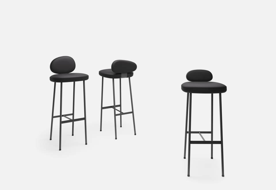 Stools characterized by slender legs, tapered as rushes, soaring to support organic silhouettes reminiscent of lake pebble-stones. Three different shapes for the backrests, so that each pebble stands out on its own.
