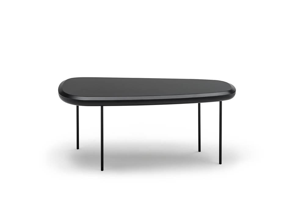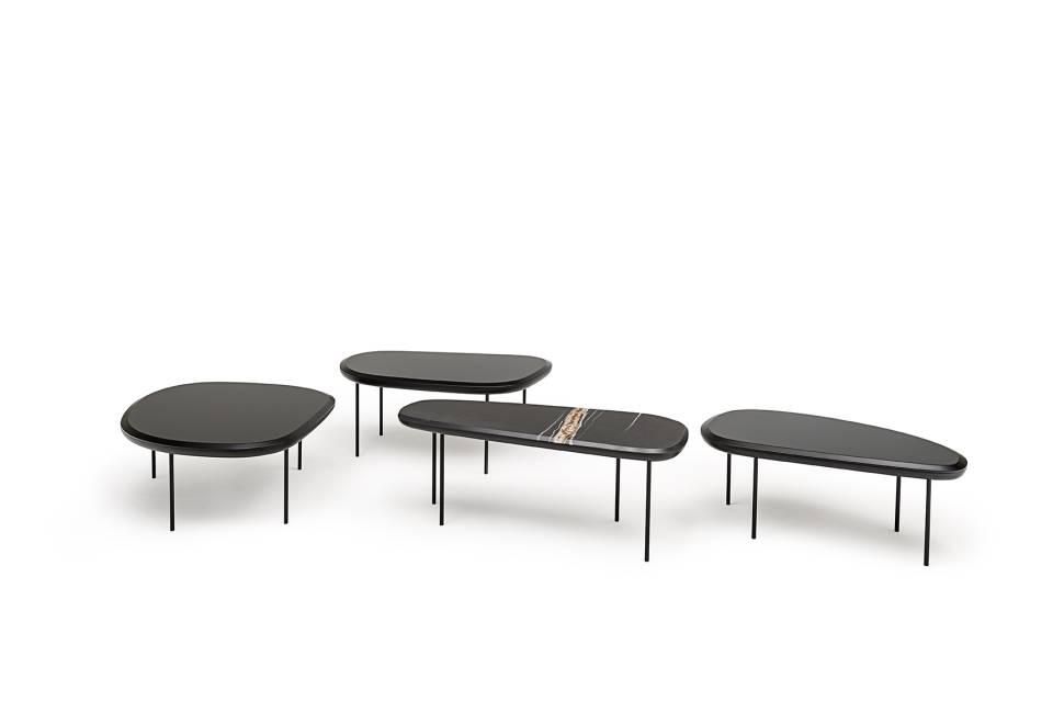 Family of small tables with organic shapes, with monobloc top composed of a bevelled top available in MDF lacquered matt black or in marble, screwed to the lower edge of the top in MDF always lacquered matt black, fitted with fixing bushes to screw the tubular steel feet ?12 mm lacquered with epoxy powder coating gunmetal grey colour. Floor support secured by black PVC feet. Tops in marble, available in white Carrara, red Levanto, black Marquinia and Sahara Noir, with a satin finish and a matt transparent protective varnish or with matt or glossy polyester finish.