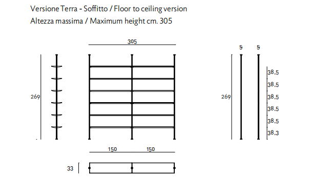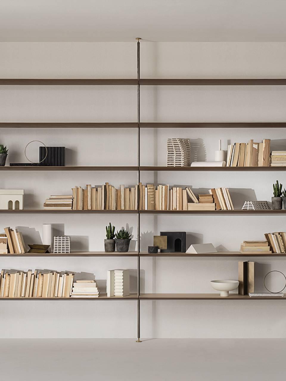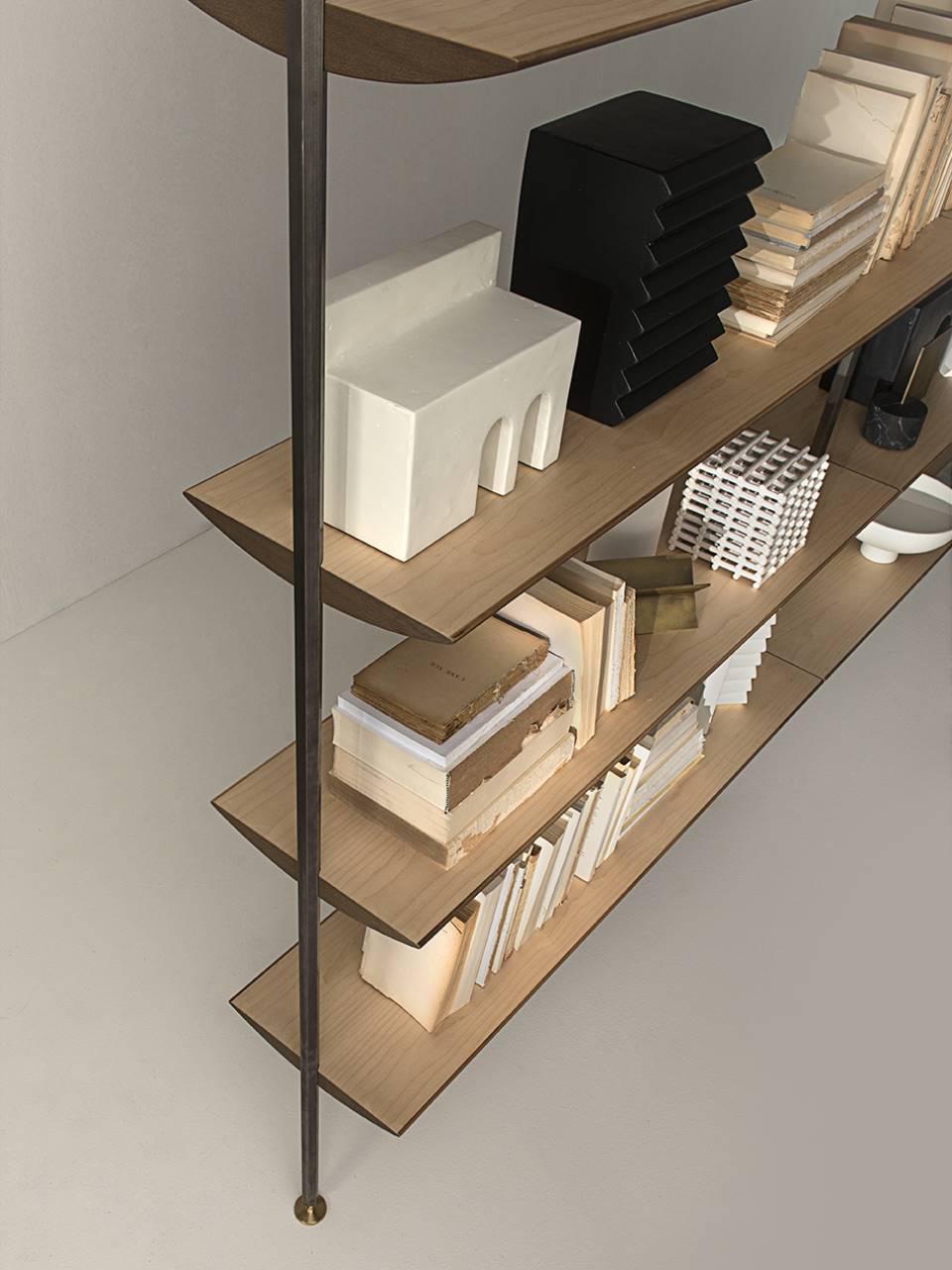 Bookcase inspired by the world of boating, which allows maximum freedom for floor-to-ceiling or wall mounted compositions. Steel uprights with hexagonal section 25 mm, fitted with holes having a center to center distance of 38,5cm (35cm of useful space) to install the shelves, and an additional wall fixing spacer, for greater structural rigidity (for the both versions). Uprights finishes: matt transparent liquid painted steel or brass coloured steel with matt transparent finish. Floor-to-ceiling support plates with joint, ?50 mm in satinized brass with a transparent matt varnish, screwed to the uprights. Floor, ceiling and wall support secured by black PVC elements. Maximum height of uprights: floor-to-ceiling version 305 cm; wallmounted version 250 cm with plate fitted for wall mounting (with a fisher) and wall support guaranteed by black PVC rounds. “Keel shaped” shelves (75/90/120/150 cm depth 33 cm) made of extruded aluminum bar, with glued an upper top in MDF (thickness 3mm) veneered in the finishings in collection and with terminal parts in solid wood, always in the same finishing of the “keel”, fitted with joints to allow the fixing to the uprights. Shelves available in the finishes: Stone Oak? veneered top with matt black painted “keel” part and terminal parts; top in bleached maple with “keel” and terminal parts in Canaletto walnut “rigatino”.