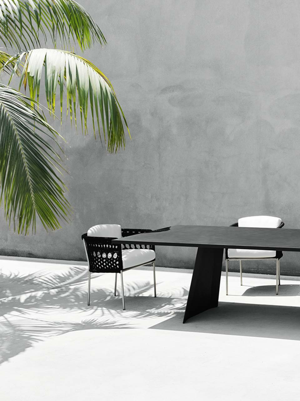 Armchair available for indoor and outdoor. Indoor version: tubular steel frame with chromed finish, or with epoxy powder coating gunmetal color or in AISI 316 Stainless Steel with matt satin- finish. Seat panel in tubular steel with epoxy powder coating, padded in polyurethane foam (for chrome and lacquered versions) or in self- supporting decorative HPL plastic laminate (for AISI 316 stainless steel version). Seat cushion in differentiated density polyurethane foam, covered with acrylic fibre layers. Backrest cushion in preformed polyurethane foam covered with acrylic fibre layers. Fabric or leather upholstery, both fully removable by zippers, after unscrewing the seat panel from the frame (for chrome and lacquered version). Outdoor version: tubular steel frame in AISI 316 stainless steel with matt satin- finish. Seat panel in self- supporting decorative HPL plastic laminate. Seat and backrest cushions padded with open-cell structure polyurethane foam and covered with fibre for outdoor. Upholstery with outdoor fabrics only, fully removable by zippers. Both version woven with a hypoallergenic, recyclable, eco-friendly tubular, suitable both.