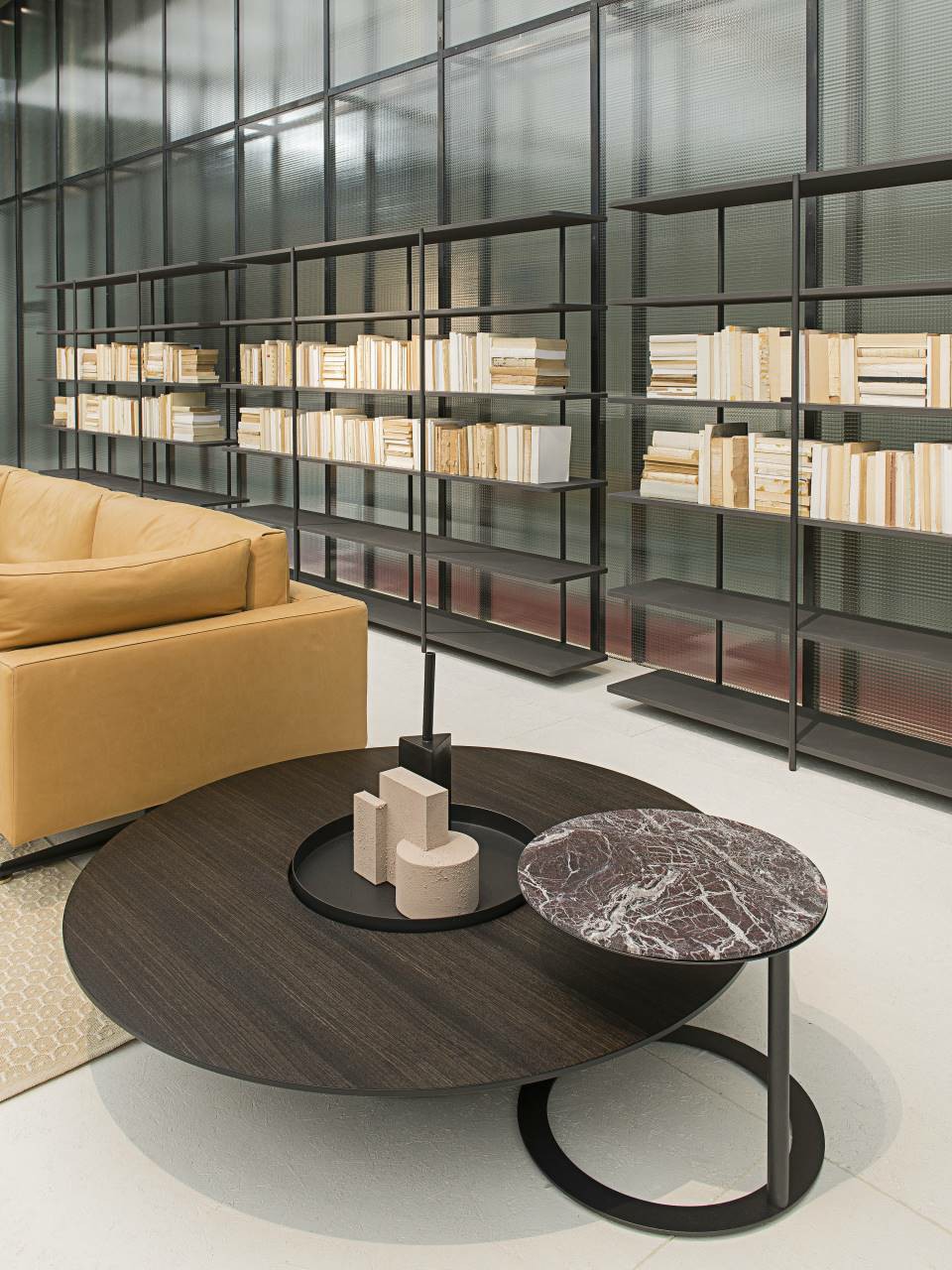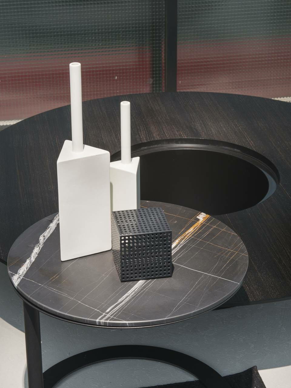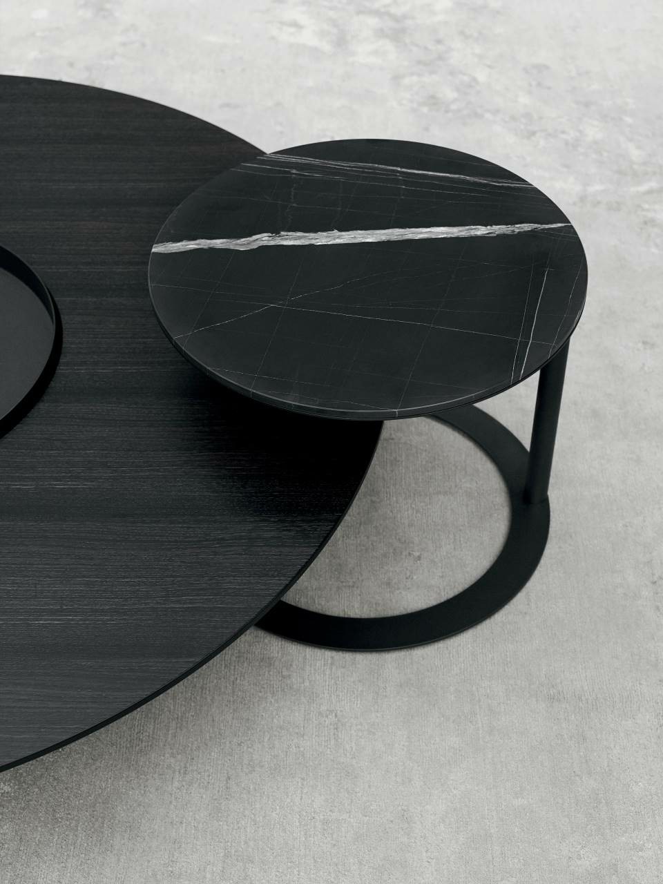 Table with central open compartment, composed of a MDF  ring-top, ?128 cm outer and ?49 cm inside, 25 mm thick available  veneered or polished, and a base - with a central compartment  - in “sandwich” of multilayer and MDF lacquered matt black.  Veneered version: top veneered, on the top part only,  in charcoal-dyed oak or Stone Oak?, with acrylic painting  finish; edge and bottom always lacquered matt black.  Polished version: top and edge lacquered in glossy RAL -K7 3005  ‘Red Wine’ with bottom always lacquered matt black. All top versions are fixed to the base by tie rods. “C” shaped side tables, in sizes ?39 H.48 cm or ?49 H.40 cm,  available with top in marble, wood or with a supporting tray,  consisting of a laser-cut steel sheet base and under-top in  pre-moulded steel sheet, joined by a ?30 mm steel leg and welded  together and finished with epoxy powder coating gunmetal grey  or burnished colour.  Top in marble, 15 mm thick (10 mm thickness at sight), with satin  finish and opaque transparent protective varnish; on request,  available also with glossy polyester finish. Top available also  in HPL 8 mm thick, veneered in charcoal-dyed oak or Stone Oak?  with acrylic painting finish. Supporting tray ?39 cm H.4 cm or ?49 cm H.4 cm in moulded  aluminum, 2 mm thick, lacquered with epoxy powder coating  gunmetal grey or burnished colour with PVC spacers. The ?49 cm tray can also be used as a closing element for the  central compartment of the ?128 cm table.