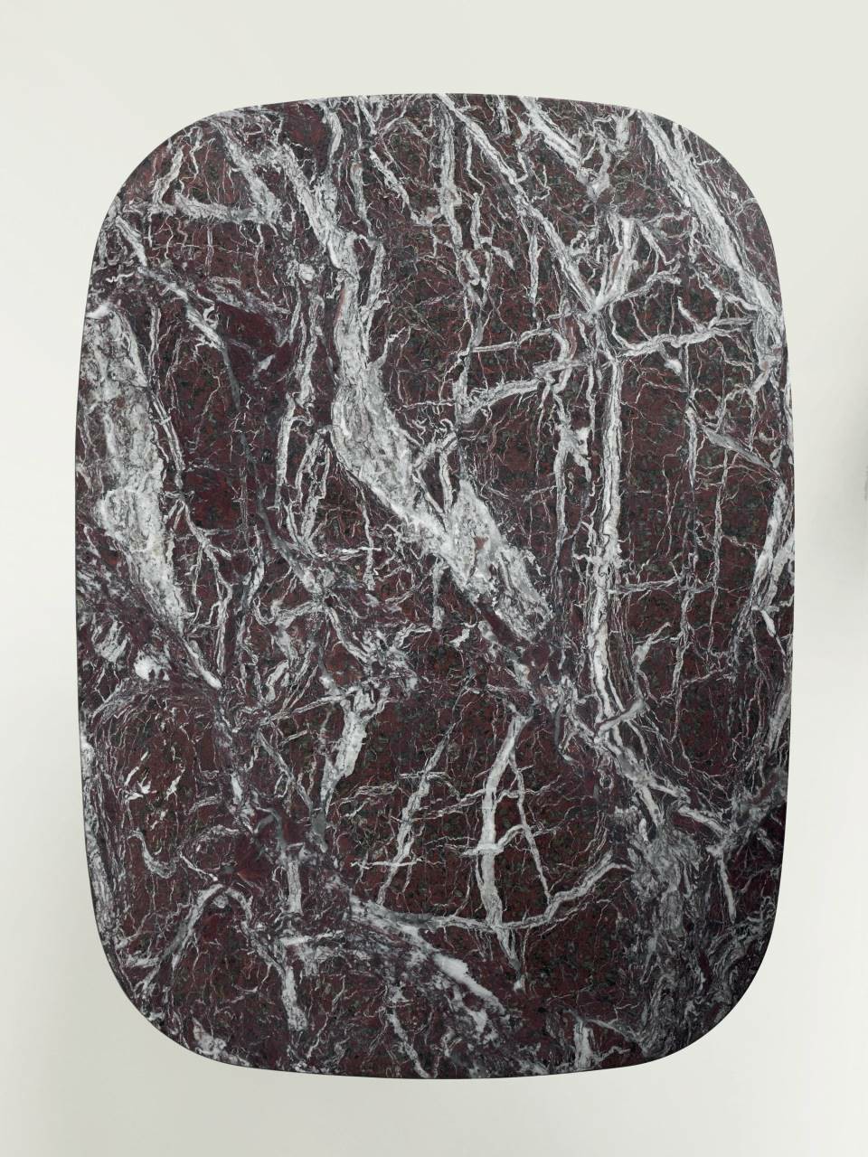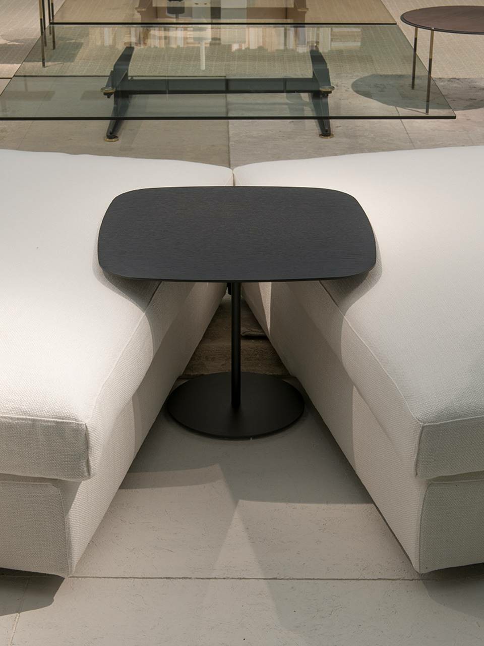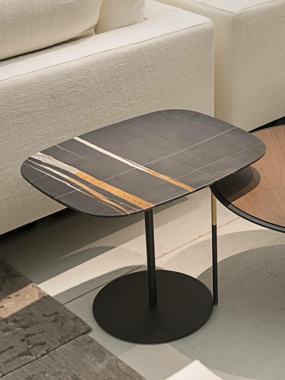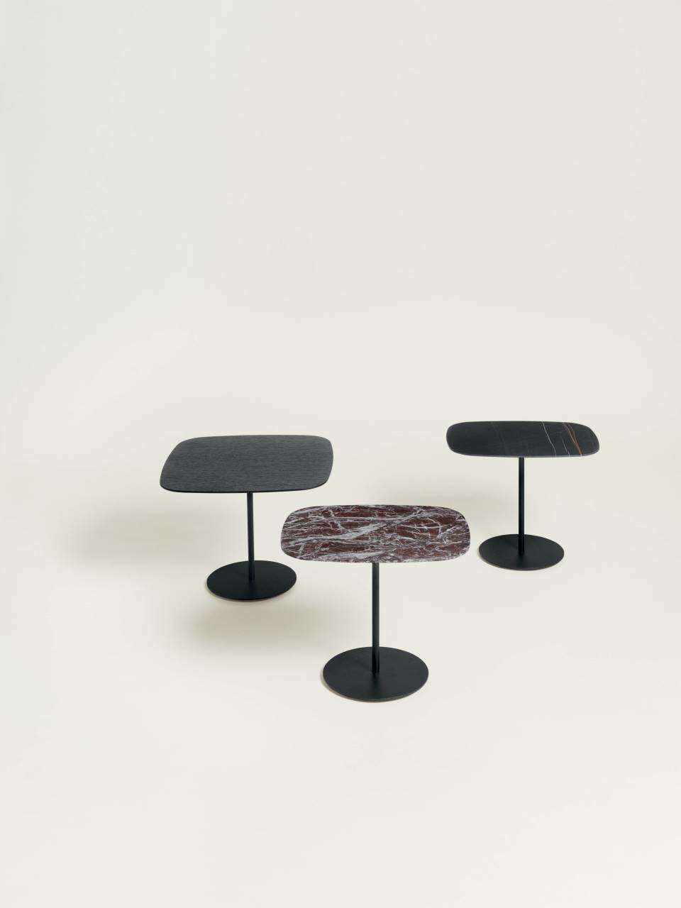 Small tables of different sizes (53x40 cm, 60x40 cm and 56x56 cm), H.42 cm  consisting of a 20 mm thick contoured MDF top veneered, on the top part  only, in charcoal-dyed oak or Stone Oak?, with acrylic painting finish; edge  and bottom always lacquered matt black. For the 53x40 cm dimension only, the top is available also in countered  marble, 15 mm thick coupled to a 2 mm steel sheet plate, available in white  Carrara, black Marquinia, red Levanto or Sahara Noir with satin finish and  opaque transparent protective varnish; on request, glossy polyester finish. Base consisting of two laser-cut steel sheets, 5 mm thick, with central  support in tubular steel ?20 mm, finish with epoxy powder coating  gunmetal grey or burnished colour. Floor support secured by black PVC feet.